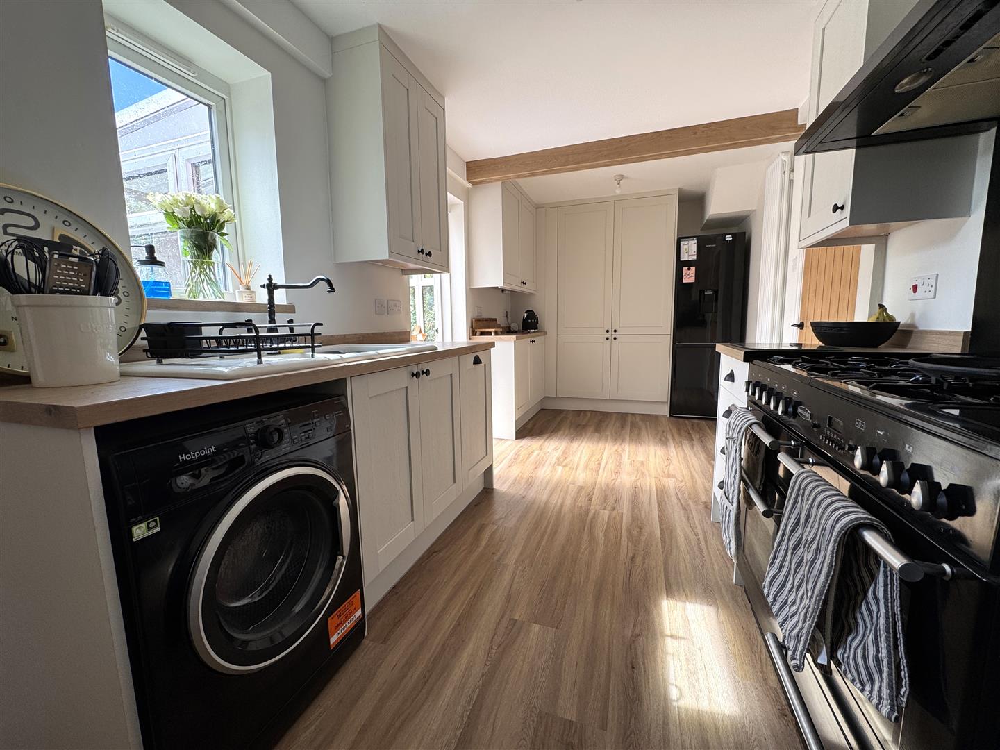 Kitchen / Dining Room - 5.74m x 2.41m (18'10 x 7'11) - Re-fitted kitchen to comprise of a range of base and wall mounted units with laminated worktops and splashbacks, one and a half bowl Belfast sink unit with mixer tap, plumbing for washing machine, integrated dishwasher, Rangemaster five ring gas top range oven with halogen hot plate, splashback and extractor fan, space for tumble dryer, space for free standing fridge / freezer, modern panelled radiator, under unit lighting, gas-fired boiler, rear aspect window, half glazed door into: