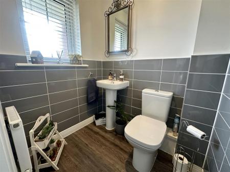Cloakroom - Low-level WC, pedestal wash hand basin, Karndean flooring, partly tiled walls, radiator, front aspect frosted UPVC double glazed window.