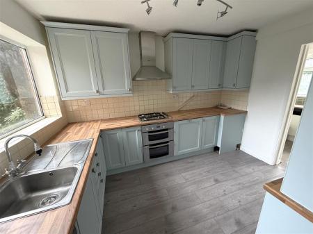 Kitchen - 3.43m x 2.54m (11'3 x 8'4) - Range of base and wall mounted units with laminated worktops and tiled splashbacks, integrated electric oven with four ring gas hob and extractor fan over, plumbing for washing machine, single drainer stainless steel sink unit with mixer tap, space for freestanding fridge / freezer, front aspect window. Opening through to: