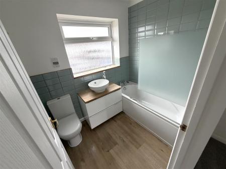 Bathroom - Modern three piece suite comprising panelled bath with mixer tap, Triton electric shower over, WC, vanity wash hand basin with mixer tap and cupboards below, laminate flooring, chrome heated towel rail, tiled splashbacks, shaver point, spotlighting, rear aspect frosted window.