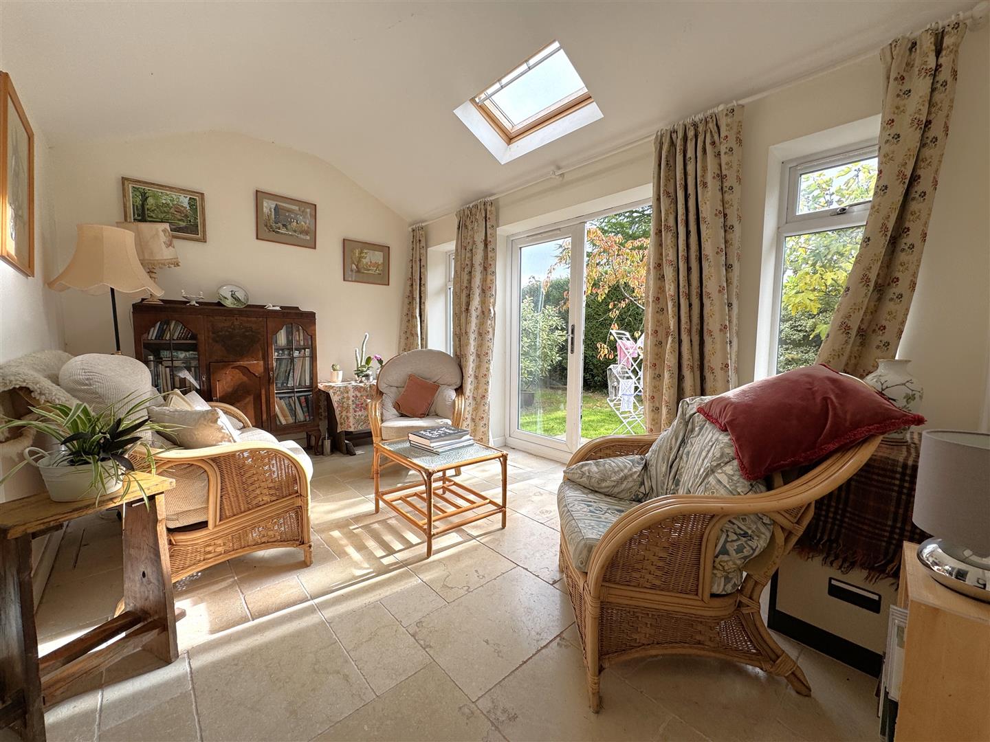Sun Room / Second Sitting Room - 4.27m x 2.82m (14'0 x 9'3) - Vaulted ceiling with Velux roof light, Mandarin stone tiled floor, full height rear aspect windows, double opening French doors to patio and gardens, thermostat control, under floor heating (to be confirmed), sliding doors into: