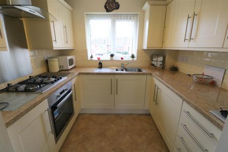 Kitchen - 2.49m x 2.01m (8'02 x 6'07) - Modern fitted kitchen comprising range of base, wall and drawer mounted units, rolled edge worktops, one and a half bowl single drainer Franke sink unit, built in appliances to include brand new oven, brand new four ring gas hob with stainless steel splashback and extractor fan above, washing machine and fridge, appliance points, power points, front aspect upvc double glazed window.