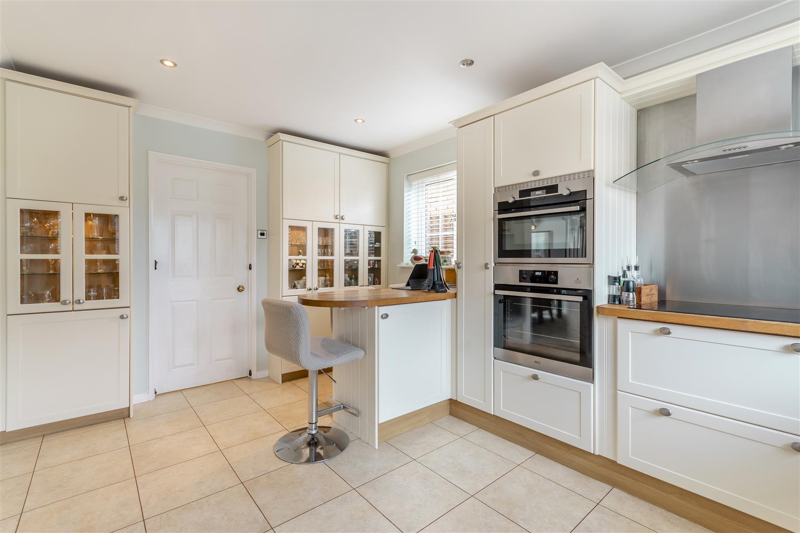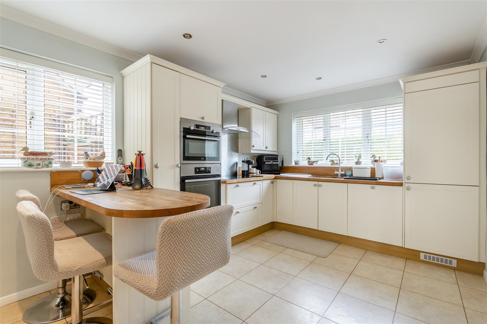 The kitchen has warm cream units, complemented by oak work surfacing and the front and side windows throw in abundance of natural light. Appliances are plentiful and include a double eye-level oven, microwave, an integrated fridge / freezer and dishwasher. There are ample units for storage, including glass fronted display cabinets, a breakfast bar and a separate utility room.