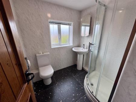 Shower Room - Corner shower with shower over, wash hand basin with cupboards below, low-level WC, heated towel rail, tiled flooring, rear aspect frosted UPVC double glazed window.