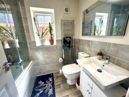 Bathroom - White suite comprising modern panelled bath with shower over, tiled surround, close coupled wc, pedestal wash hand basin with vanity below, heated towel rail, side aspect frosted window.