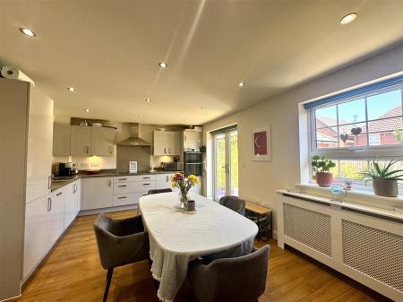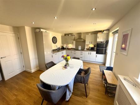Kitchen/Diner - 5.61m x 4.27m (18'5 x 14') - Fully fitted kitchen comprising a range of base and wall mounted units, drawer units, single drainer sink unit, mixer tap, cupboard under, fitted electric double oven, cupboard above and below, four ring induction hob with cooker hood above, integrated fridge/freezer, dishwasher, two single radiators, built in utility cupboard with plumbing for automatic washing machine, space for tumble dryer, shelving, gas fired central heating and domestic hot water boiler, rear aspect window having a pleasant outlook over the garden, fully glazed French doors to the rear.