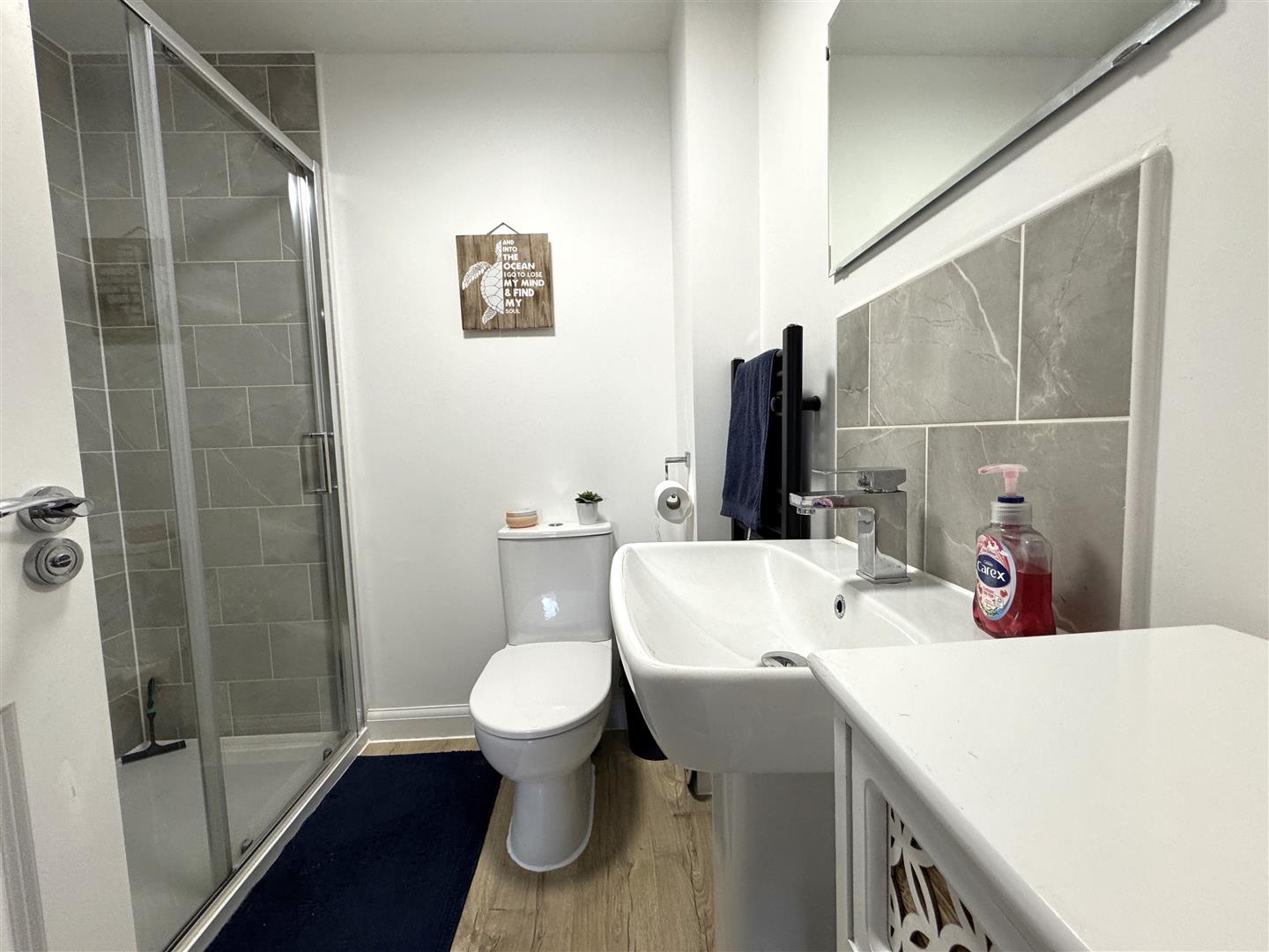 En-Suite Shower Room - 2.06m x 1.83m (6'9 x 6'0) - Double shower accessed via sliding glazed screen, inset detachable shower system, WC, wash hand basin with mixer tap, heated towel rail, tiled splashbacks, extractor fan and shaver point.