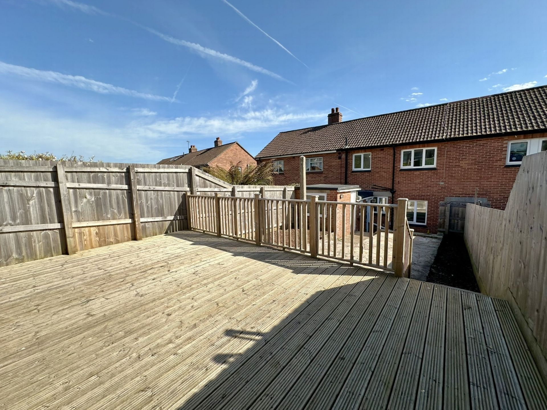 The spacious rear garden has been designed for ease of maintenance with a crazy paved patio area, planting borders to either side and a large sun deck spanning the width of the garden. There is a store/workshop with light and power and a outside water tap.