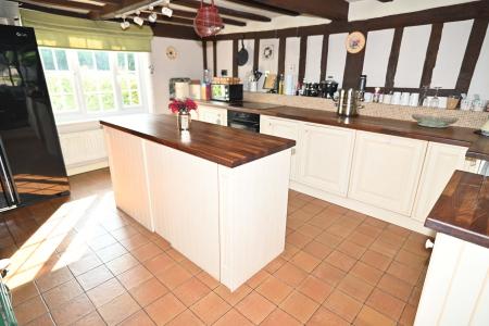 The exposed beams and window seating provide lovely features to this well-proportioned kitchen.