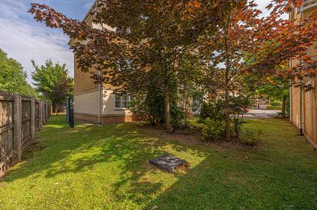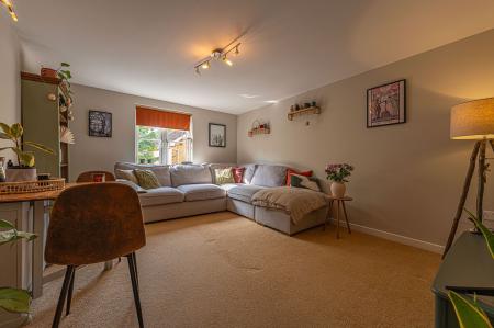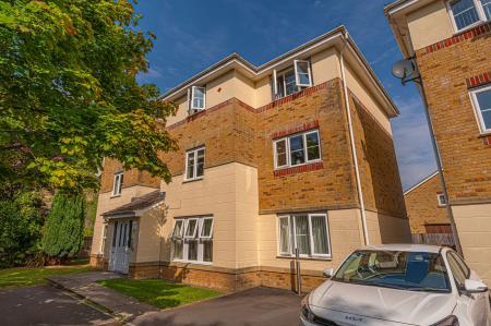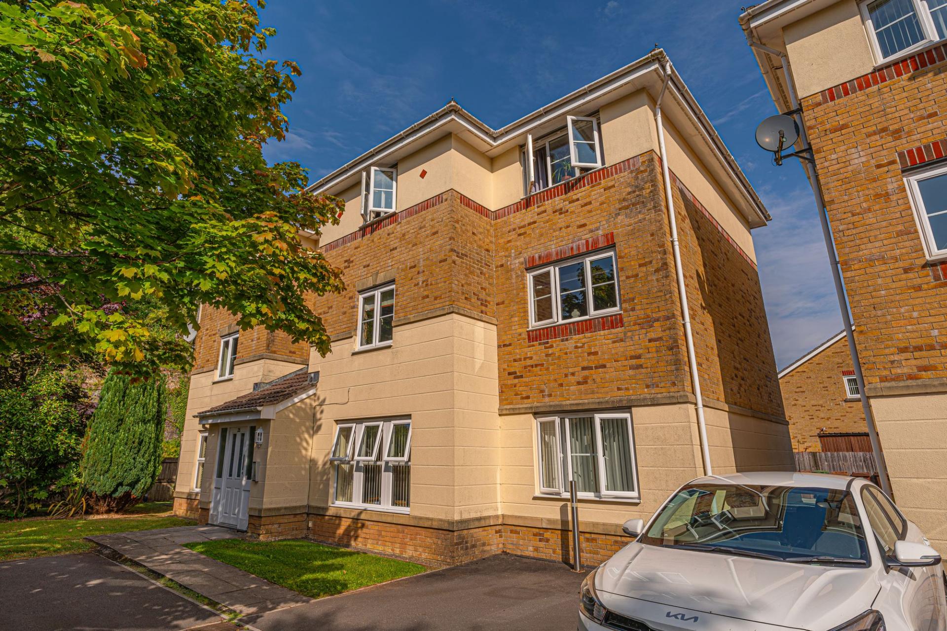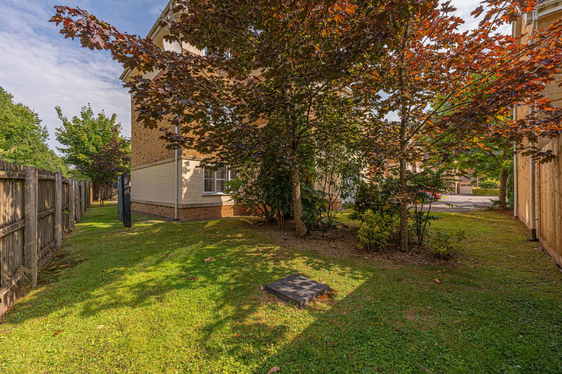 The property features a communal garden to the side, which wraps around the building and connects to the shared car park and bin storage.