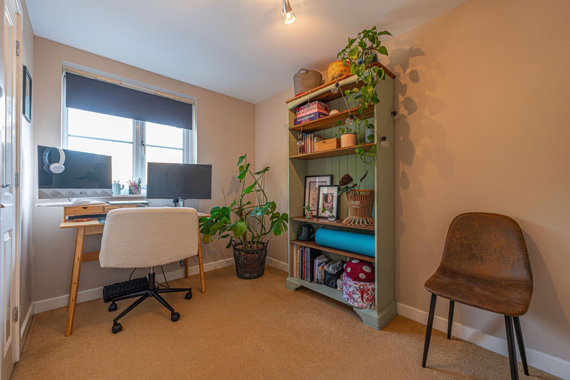 The property features two bedrooms, which can both accommodate double bedrooms, with the secondary bedroom currently in use as a fantastic home office, highlighting a great space to utilise for those who frequently work from home. Fitted storage can also be from this secondary bedroom, as well as from a helpful store cupboard in the hallway, which also leads to the bathroom, where we can find a bath suite and overhead shower.