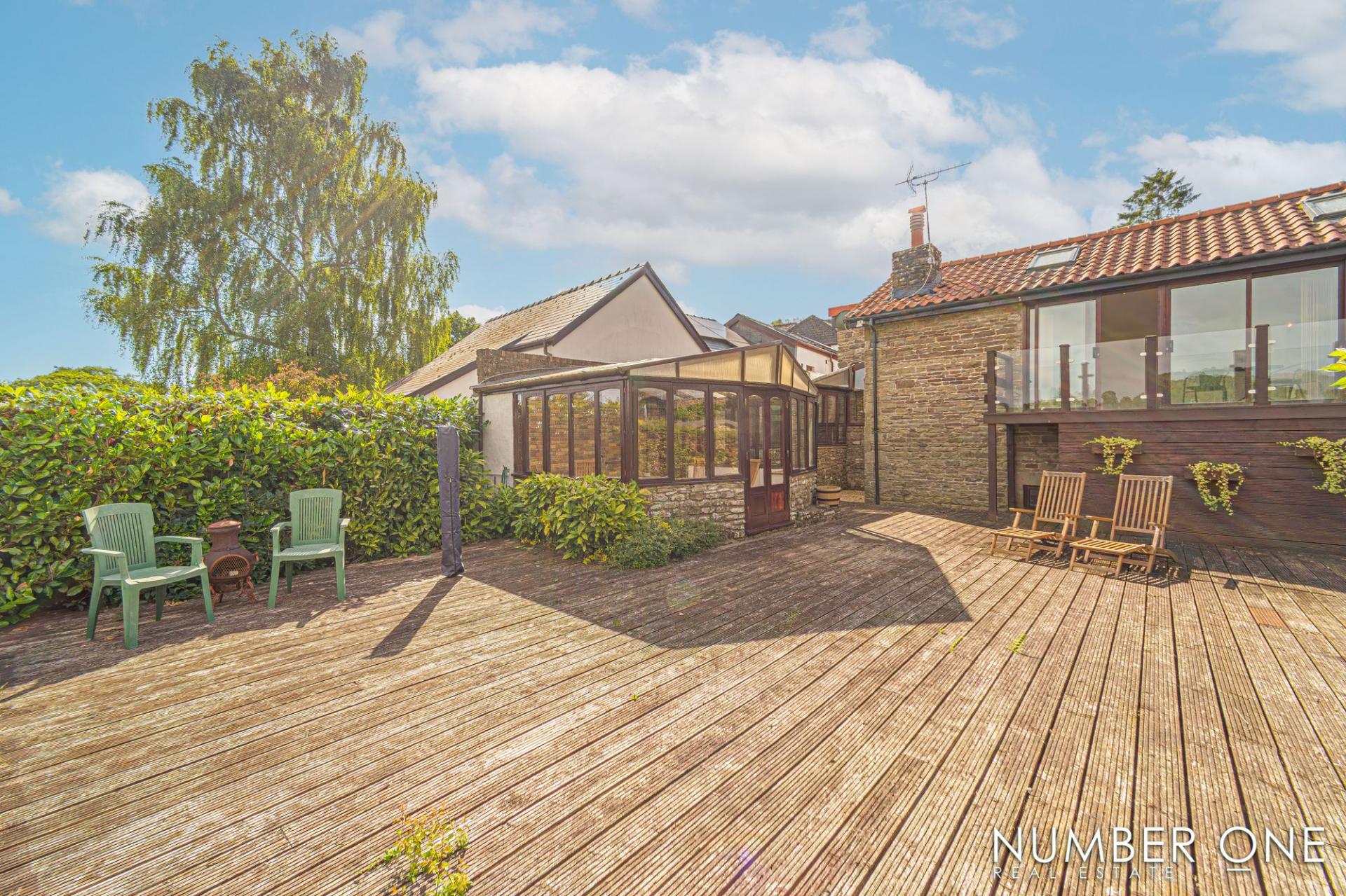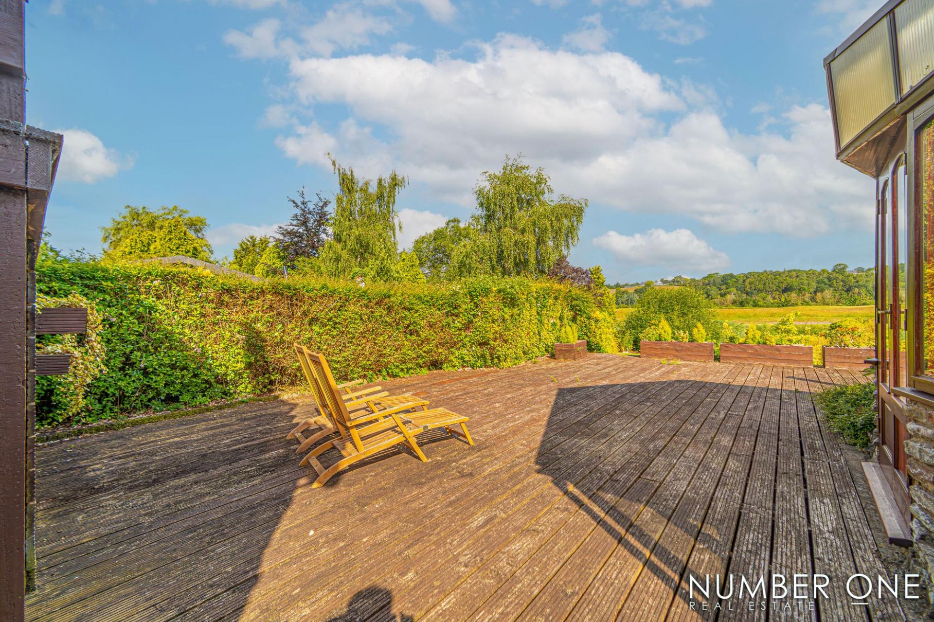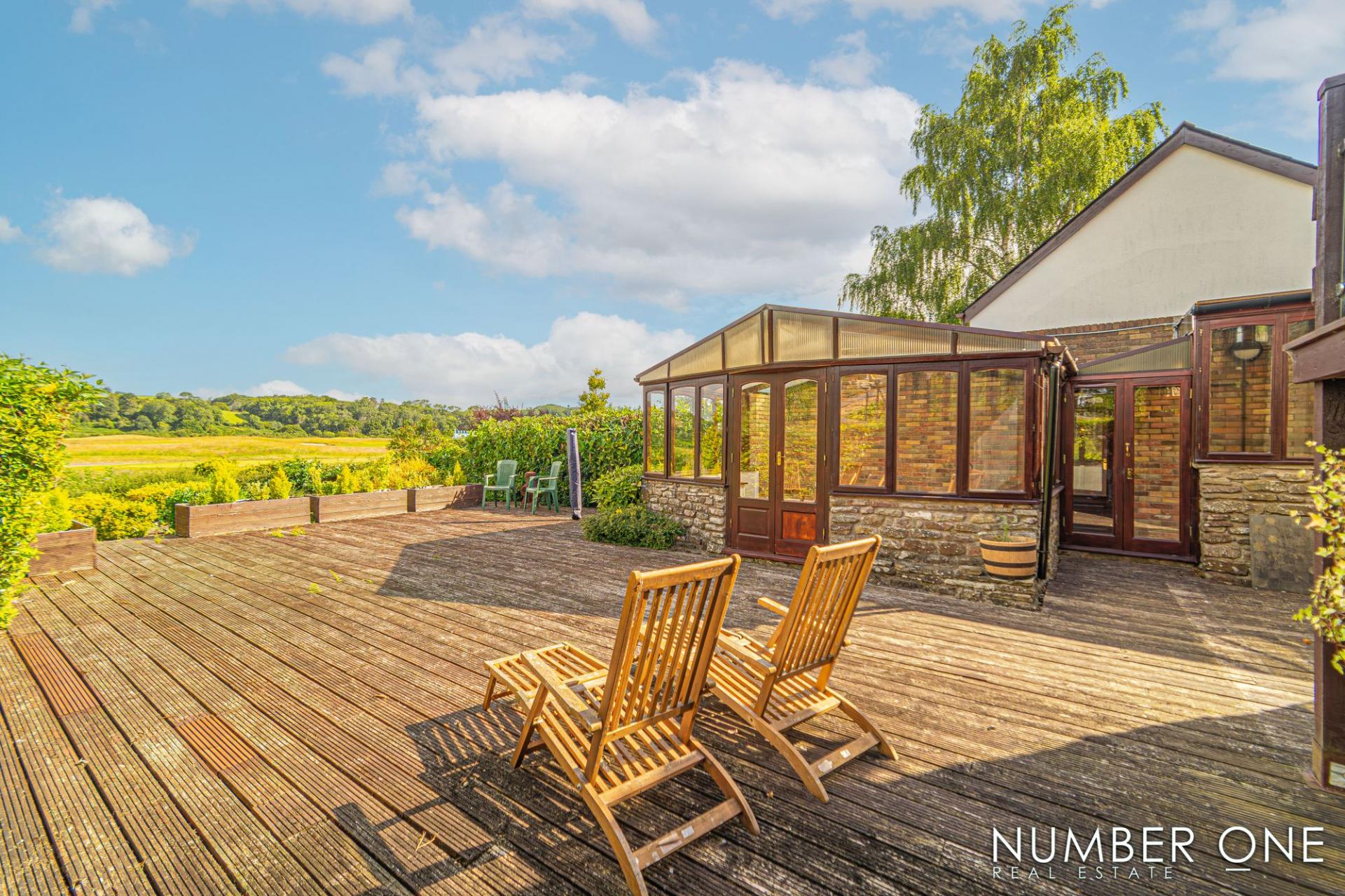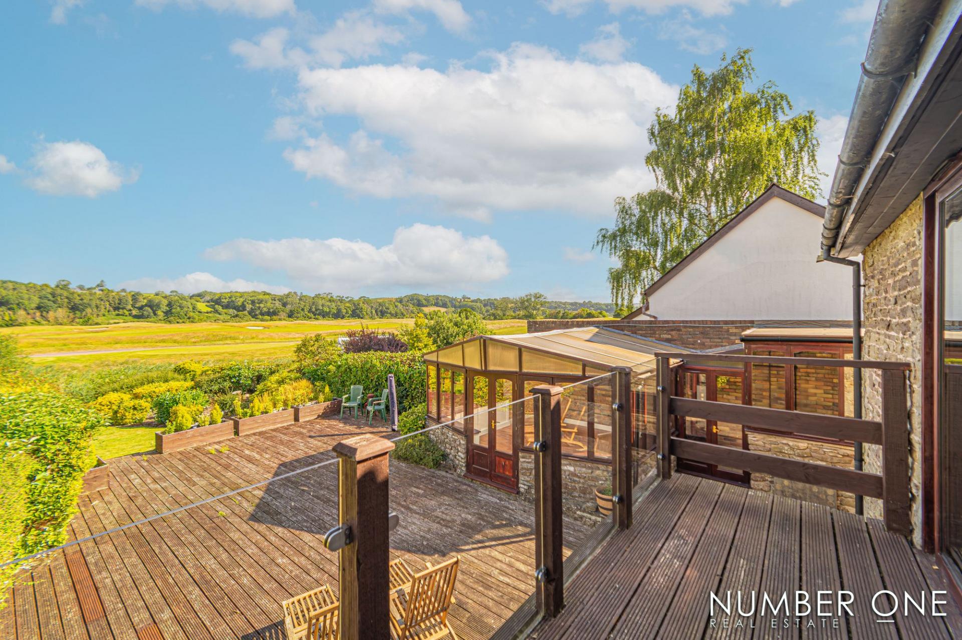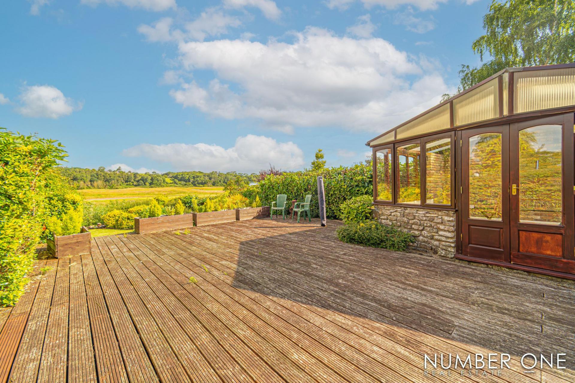 Stepping outside from the sunroom, we have the expansive rear garden, with a large private deck that stretches approximately 30 feet, offering plenty of room to entertain a huge host of guests, as well as enjoying outdoor activities like sun-lounging, al-fresco dining, and family barbeques. From the deck we can step down to a huge shared lawn adorned with flowers and foliage, that stretches across the farm and offers plenty of space for a variety of activities.