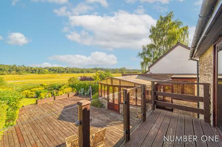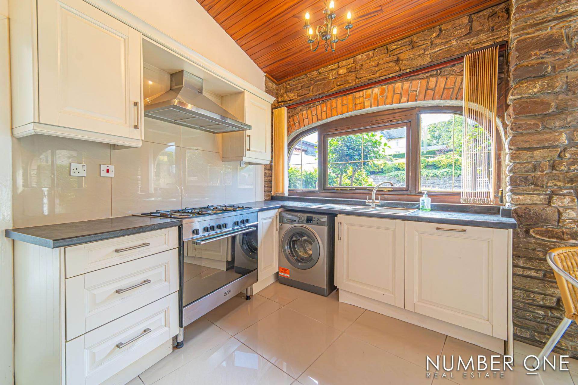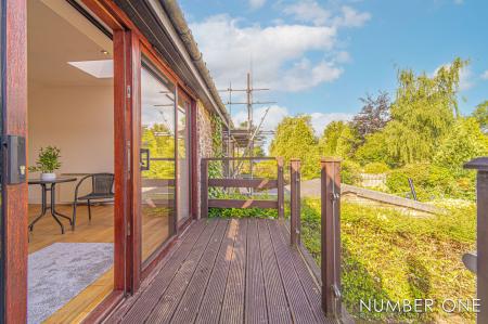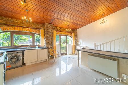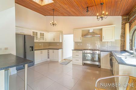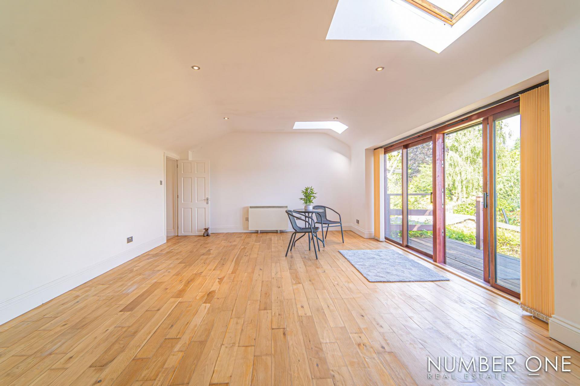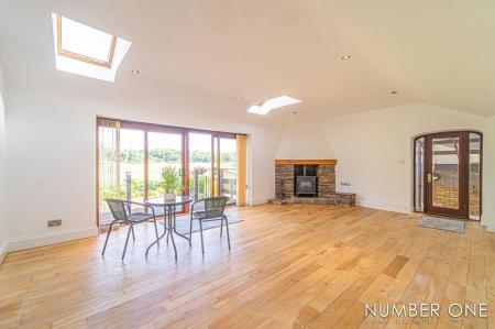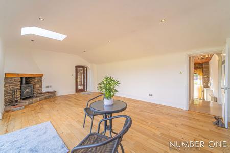 We are welcomed into this fabulous property through the front, where the spacious kitchen can be found, fitted with plenty of storage options and room for appliances and utilities to join the impressive range cooker with a 5-ring gas hob, and large oven. Towards the rear of the house we have the impressively sized living room, with plenty of room for a variety of furniture layouts, including a dining area. The living room is also fitted with a stunning fireplace with a wood burner, and is flooded by natural light through several skylights and double doors that access a lovely balcony that overlooks the garden. A doorway from the living room takes us down the sloped hallway that provides another entry to the house, as well as leading to the marvellous sunroom, allowing an abundance of light to cascade throughout this additional living space, perfect for enjoying with friends and family.