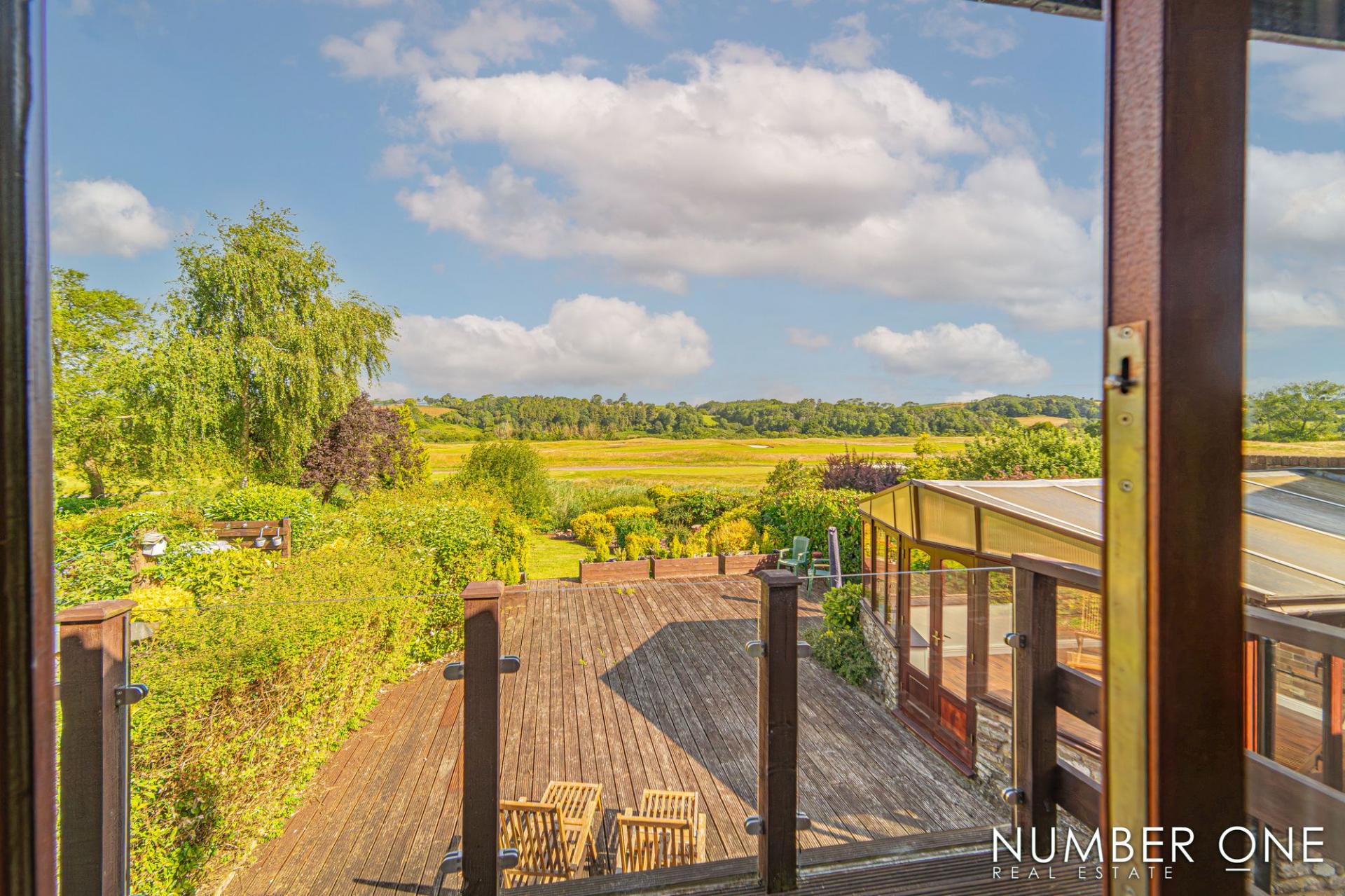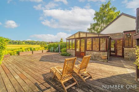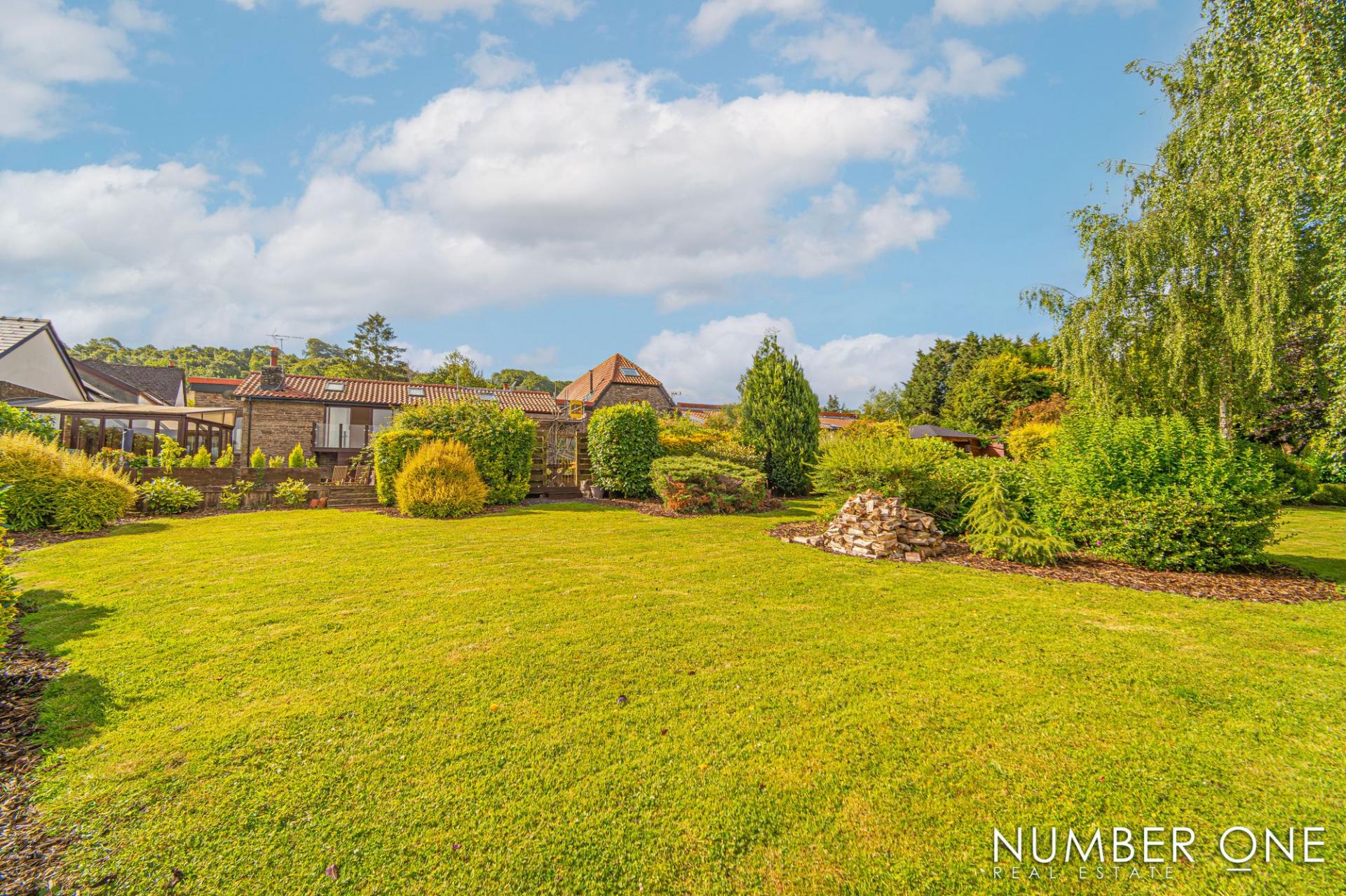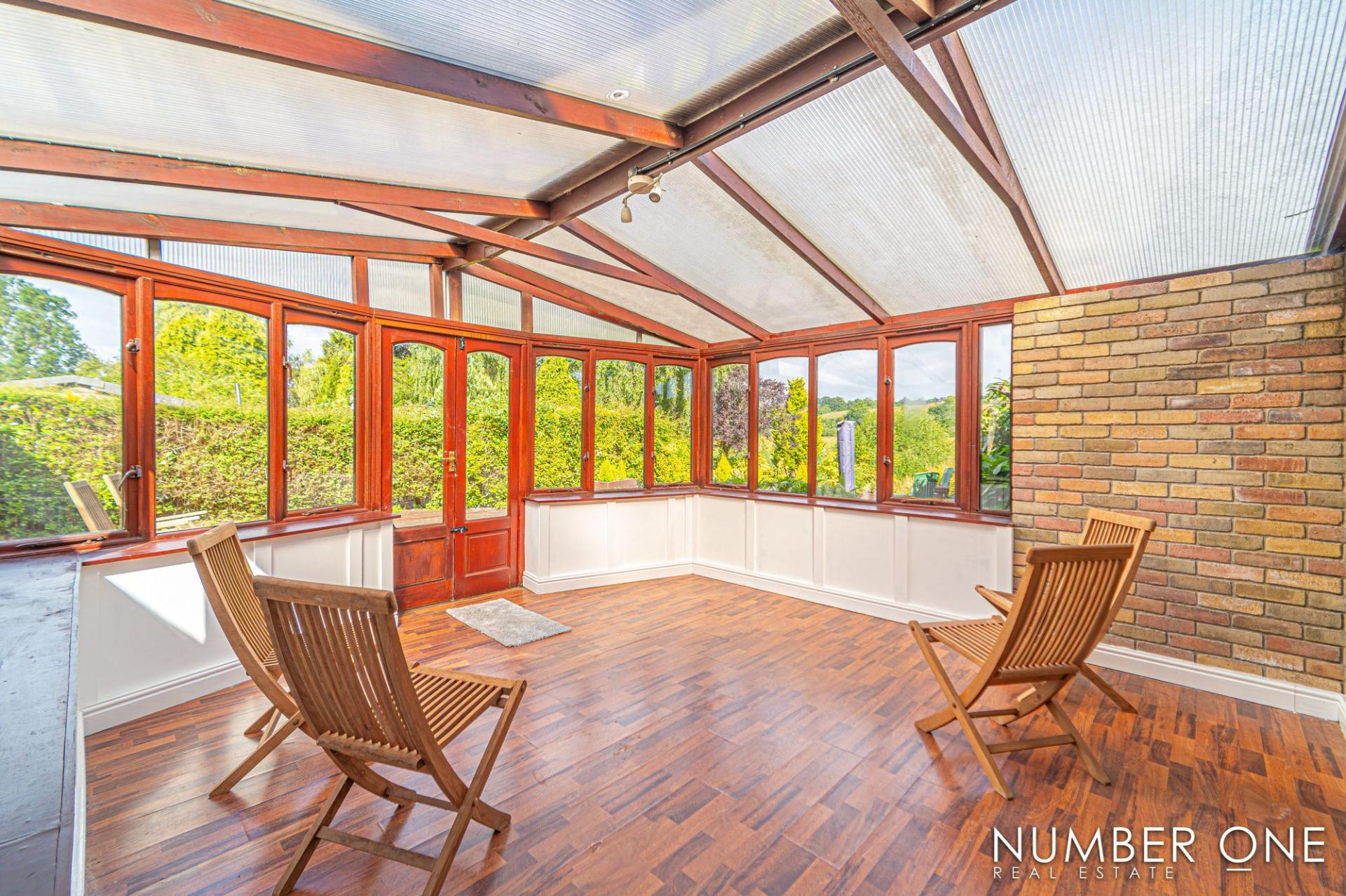 We are welcomed into this fabulous property through the front, where the spacious kitchen can be found, fitted with plenty of storage options and room for appliances and utilities to join the impressive range cooker with a 5-ring gas hob, and large oven. Towards the rear of the house we have the impressively sized living room, with plenty of room for a variety of furniture layouts, including a dining area. The living room is also fitted with a stunning fireplace with a wood burner, and is flooded by natural light through several skylights and double doors that access a lovely balcony that overlooks the garden. A doorway from the living room takes us down the sloped hallway that provides another entry to the house, as well as leading to the marvellous sunroom, allowing an abundance of light to cascade throughout this additional living space, perfect for enjoying with friends and family.