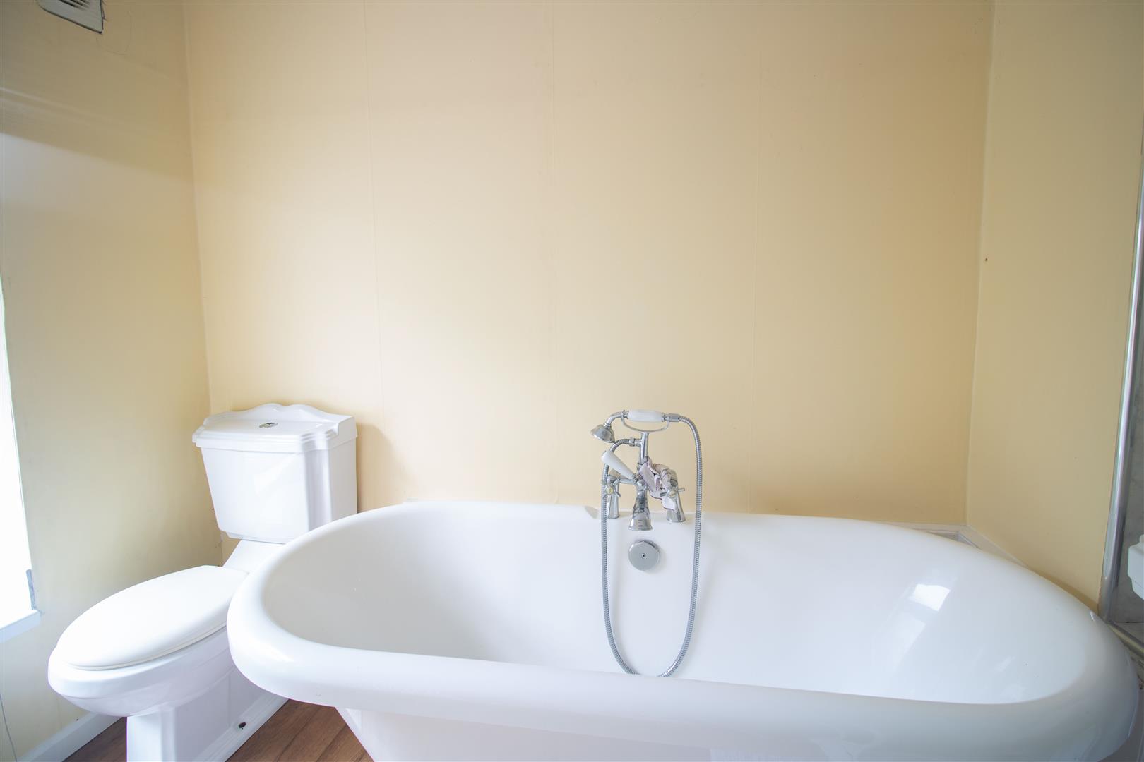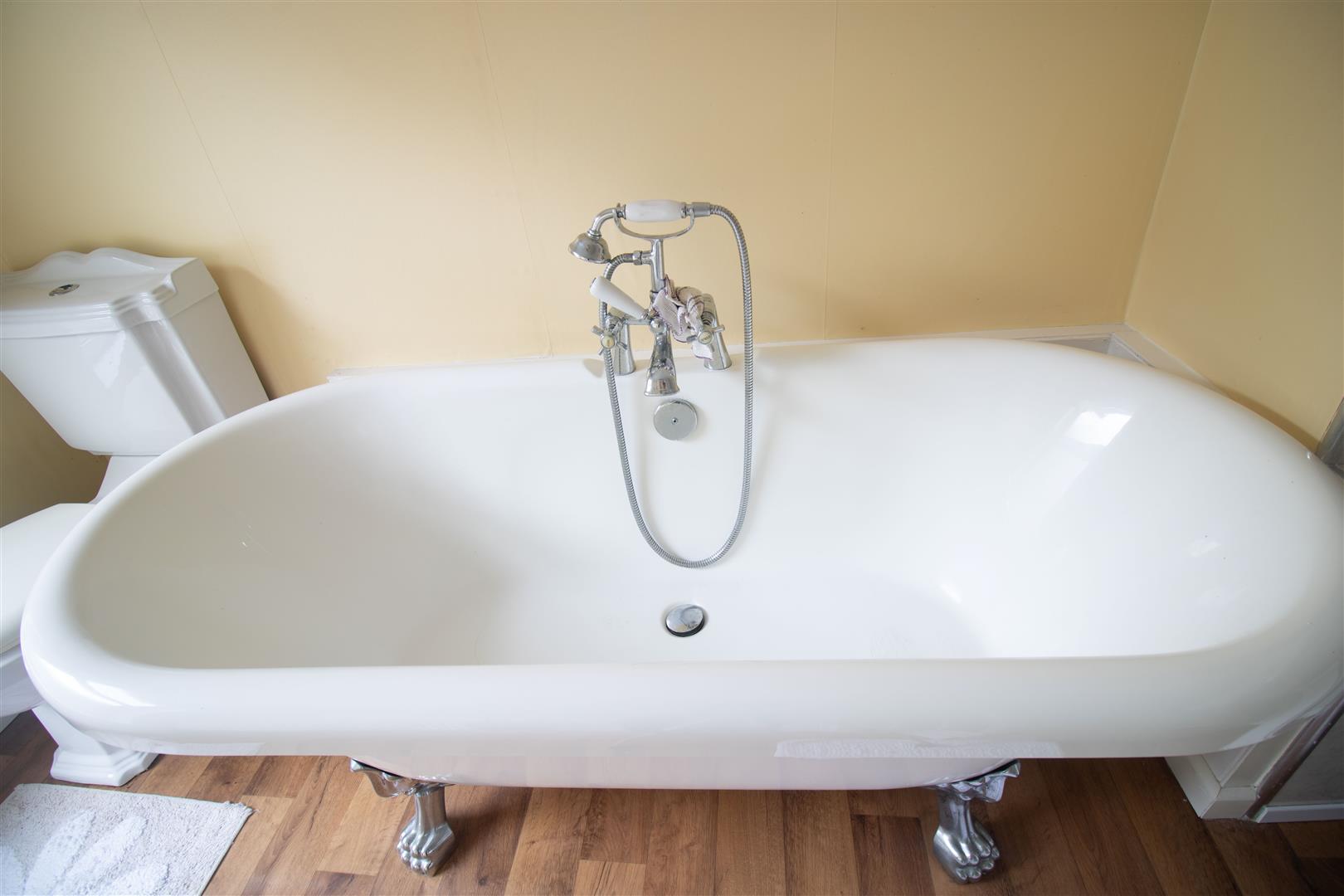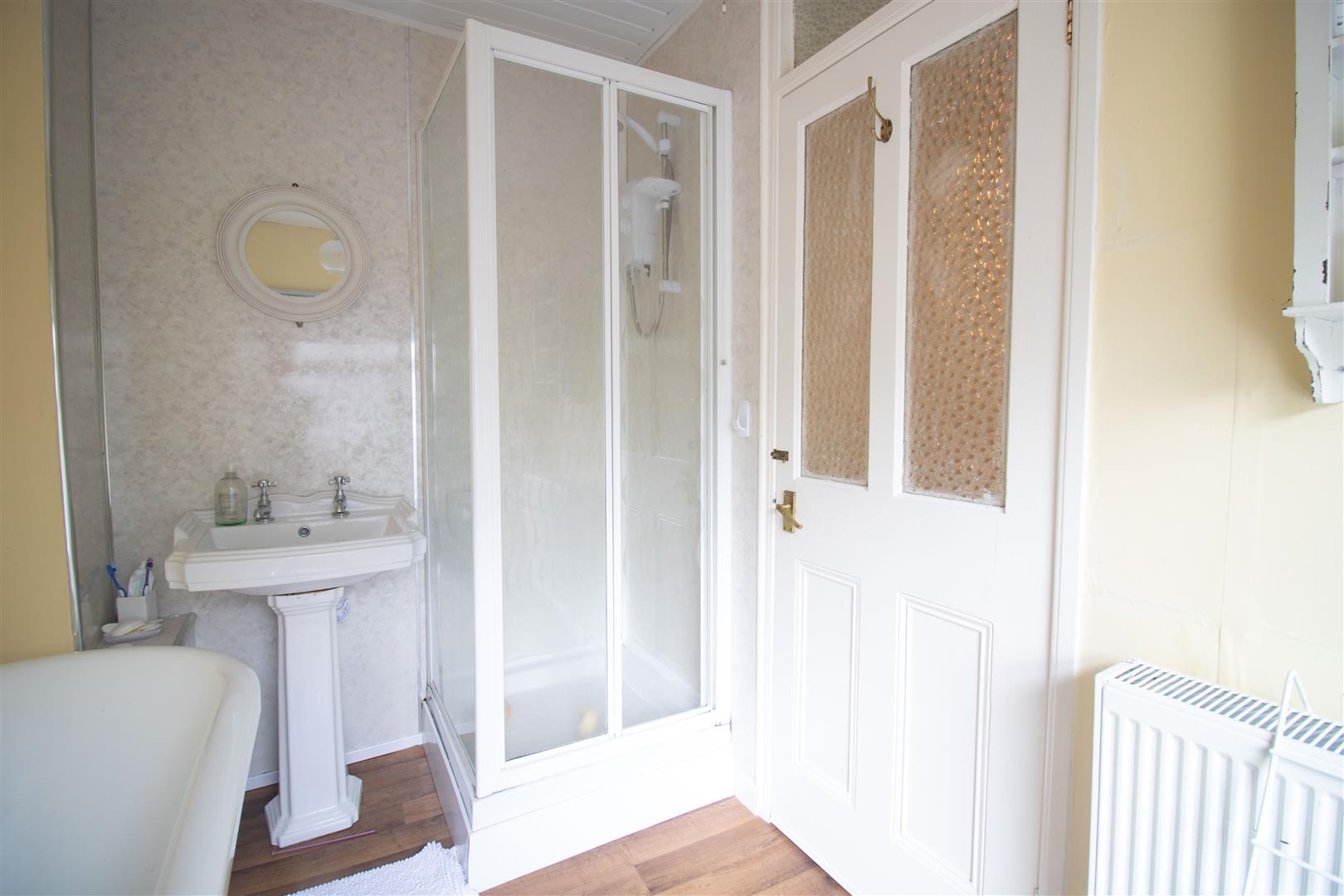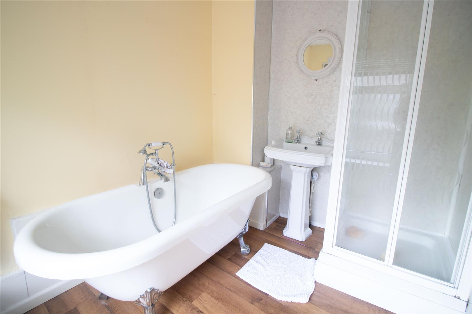 Bathroom - 2.0 x 2.79 (6'6" x 9'1") - UPVC double glazed obscured window to side, roll top free standing bath, shower unit with tile splash back, pedestal hand wash basin, low level w/c, wallpapered walls, plastic cladding to ceiling, vinyl floor, radiator.