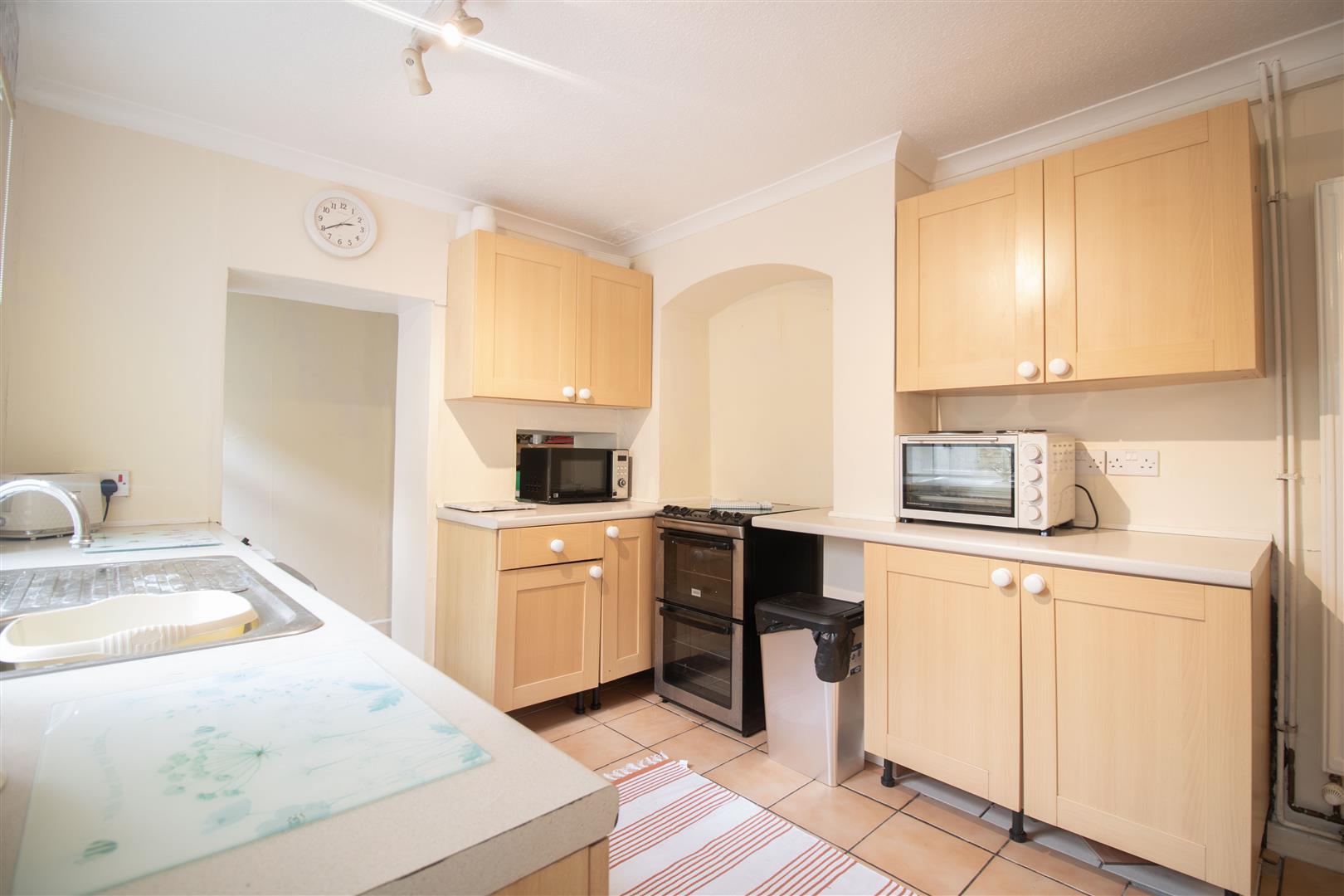 Kitchen - 3.83 x 3.06 (12'6" x 10'0") - UPVC double glazed window and door to side, matching base and wall units, rollover edge work top, stainless steel sink with drainer and mixer tap, tiled floor, wallpapered walls, textured ceiling, radiator, power points.