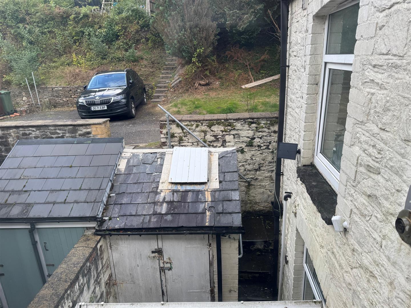 To Rear: Small patio area, shed, steps leading to rear lane.