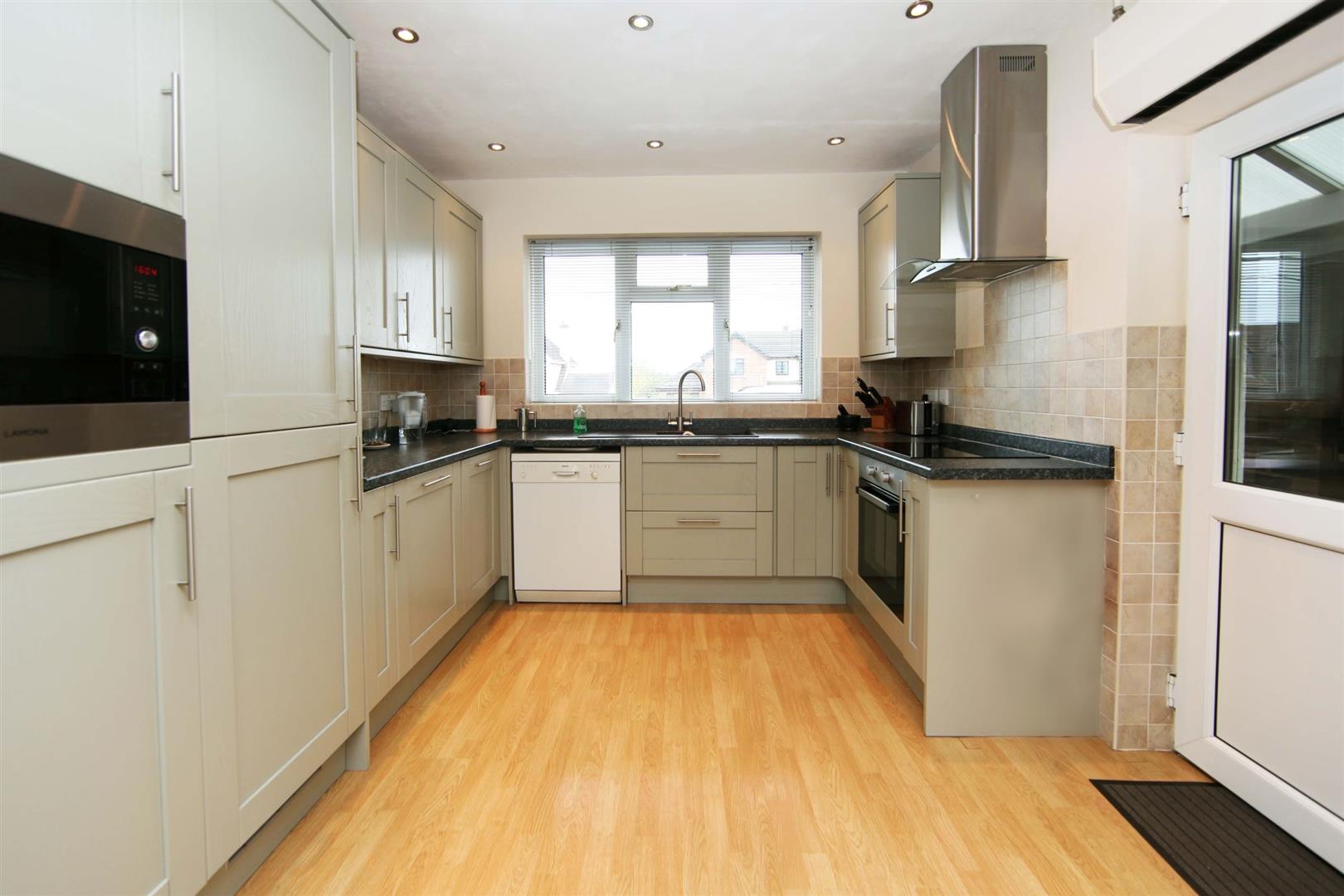 Kitchen area having a good range of modern fitted base and wall mounted cupboards, the former finished with roll edge work top. Inset 1 1/2 bowl sink unit with mixer tap. Recess below suitable for a dishwasher. Built-in electric oven with 4 ring induction above and filter extractor hood above. Integrated fridge-freezer and built-in microwave with cupboards above and below. Splash back wall tiling and recess spotlights. uPVC framed double glazed window with outlook to the front. Laminate flooring. uPVC framed double glazed side door to covered passageway.