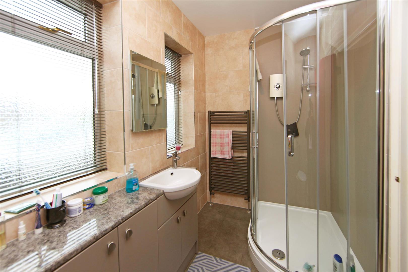 Modern Tiled Shower Room - Refitted with good size quadrant style shower cubicle having electric shower. Low-level flush WC and inset wash hand basin with vanity cupboard below and to the side. Towel panelled radiator. Two uPVC framed double glazed windows.
