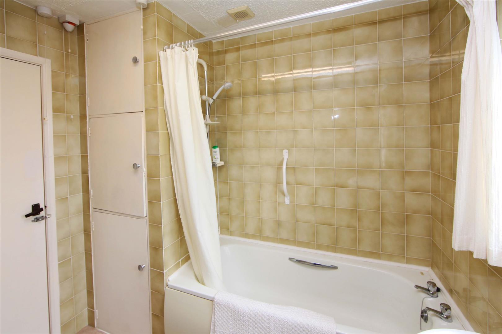 Bathroom - suite comprising enamel surface bath, pedestal wash hand basin and low level W.C. Electric shower over bath. uPVC framed patterned double glazed window. Radiator. Built-in airing cupboard with lagged hot water cylinder.