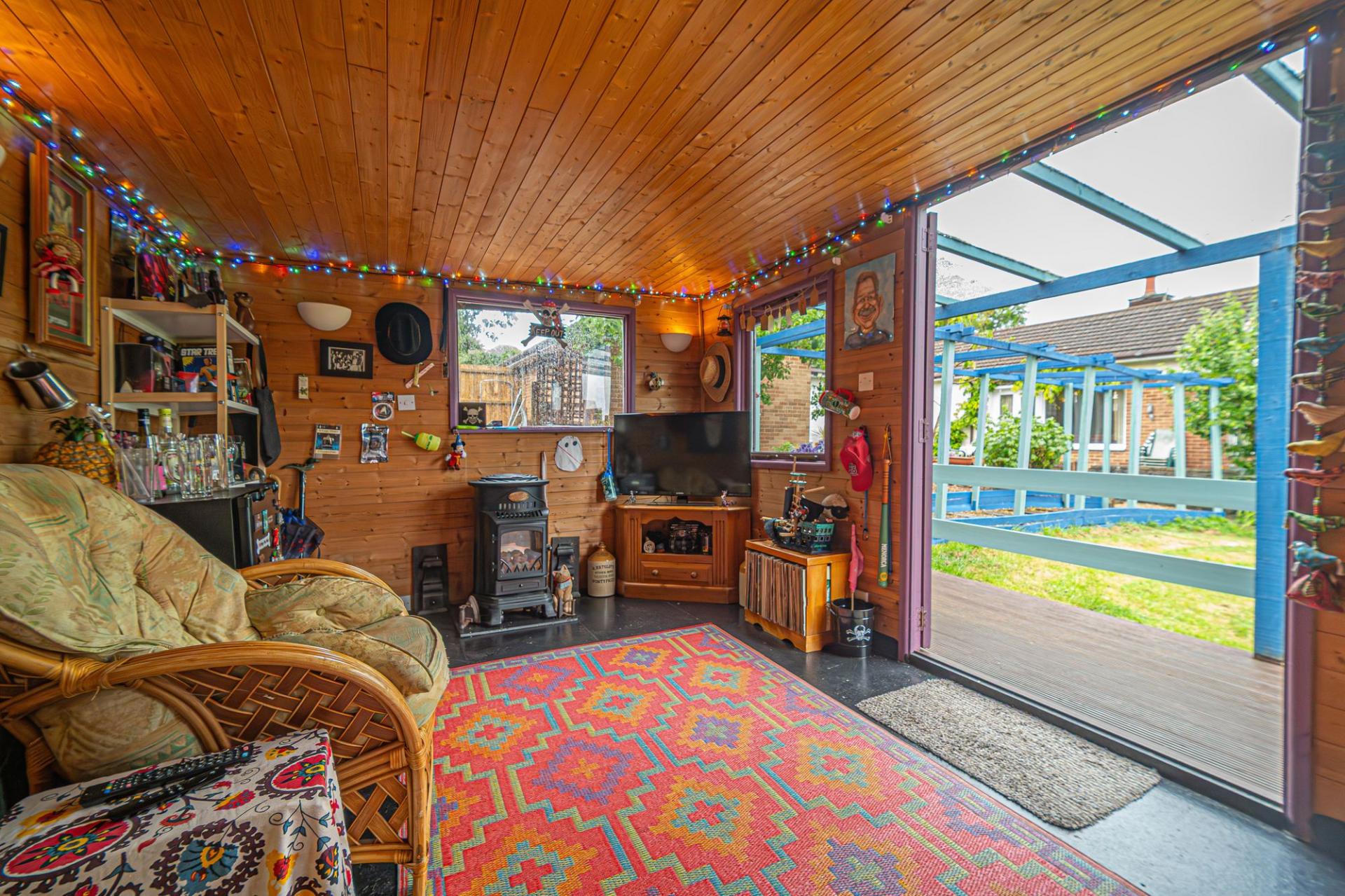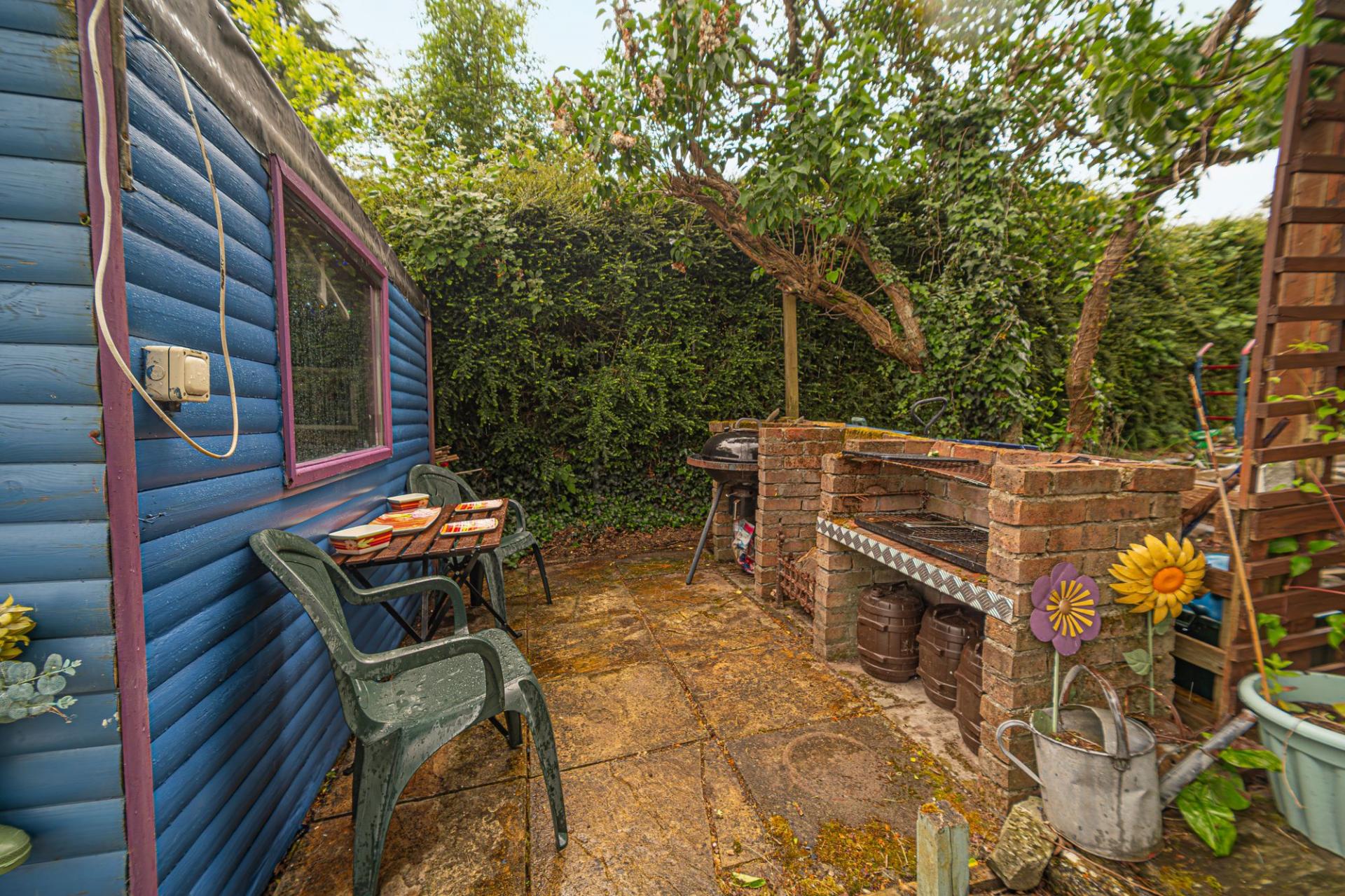 Stepping outside we can find a sizeable driveway that can provide convenient parking for a large host of vehicles, while sitting adjacent to a sizeable grass lawn at the front of the house, providing a warm welcome from the private lane connecting to the main road. This impressive garden plot continues at the rear of the house, with the expansive grass lawn providing an abundance of space for sunbathing, family games and entertaining guests, while wrapping around to meet a spacious patio that can also be accessed from the lounge and primary bedroom. In addition to the already plentiful space, a pathway connects us to a magnificent summerhouse cabin, which is well equipped with electricity and lighting, and perfect for enhancing garden parties or providing a relaxing haven for reading or working.