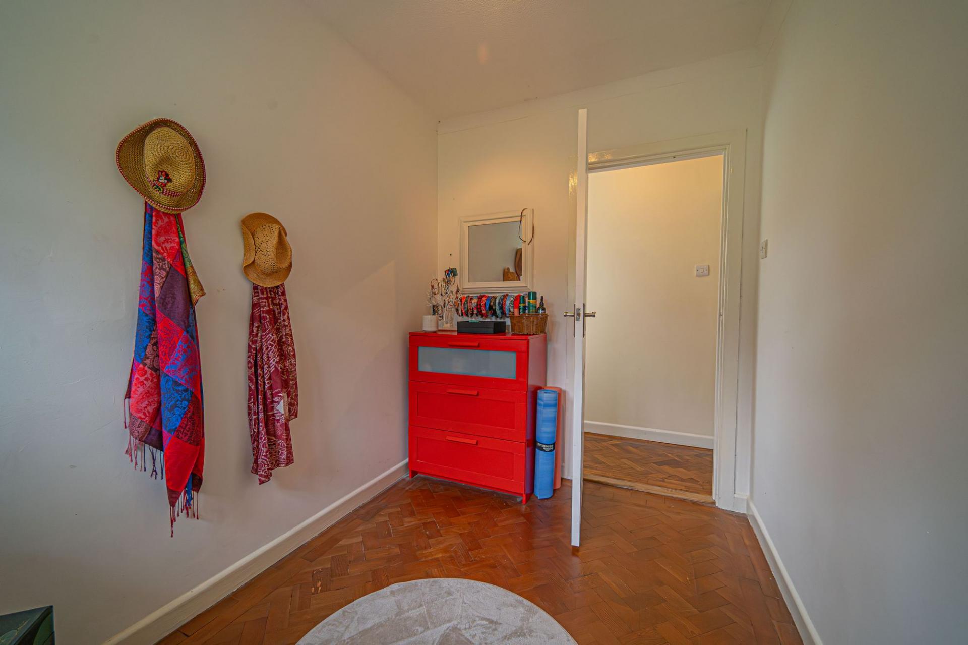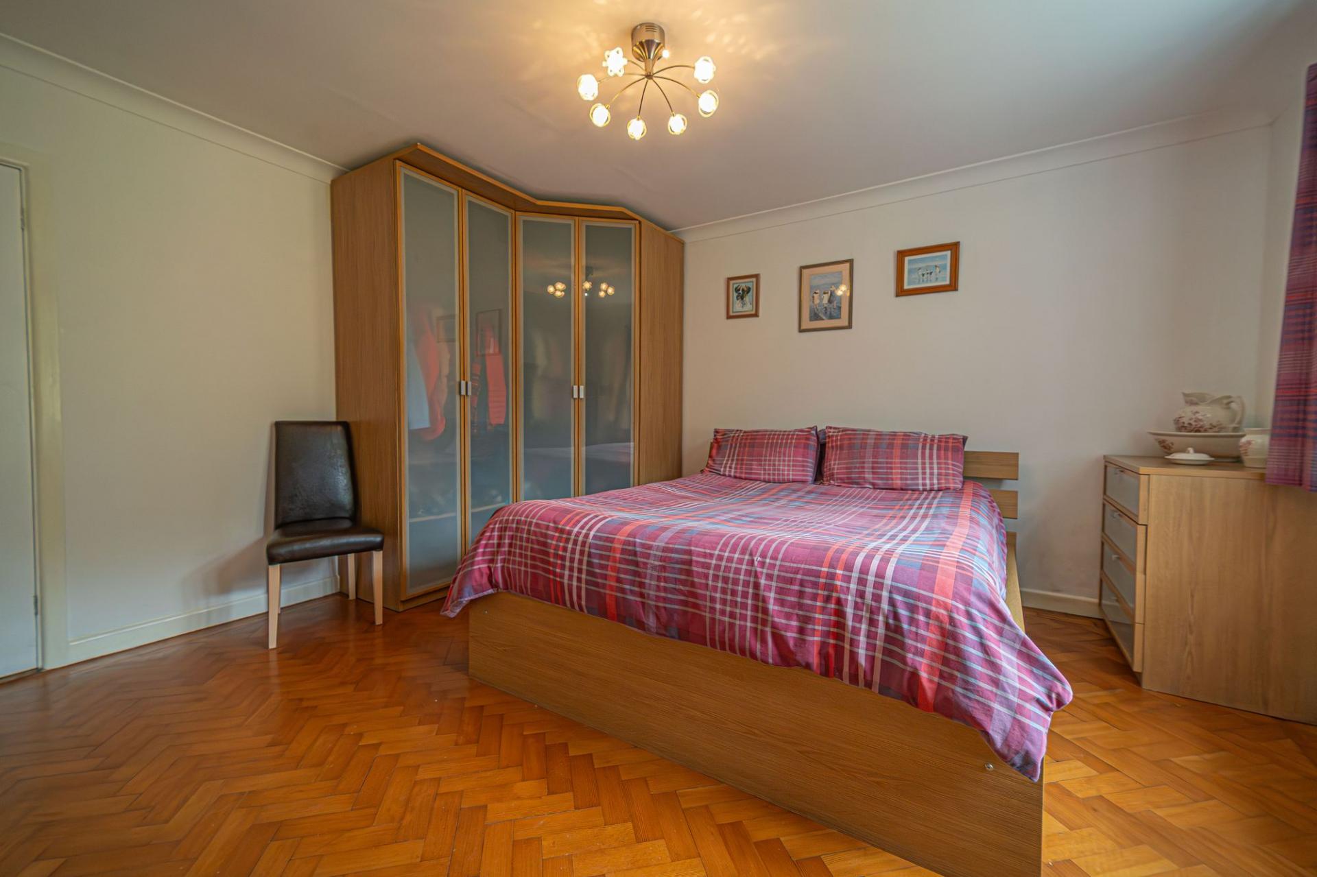 To the opposite end of the property we can find a hallway that connects us to the three bedrooms. Two of these bedrooms are very generously sized double rooms that enjoy a great amount of light, and come with fitted wardrobes, while the third bedroom is a cosy single, which could also be used as a home office or dressing room. These three bedrooms share the family bathroom, which features a bath tub and a separate shower, while a useful storage cupboard provides further convenience from the hallway.
