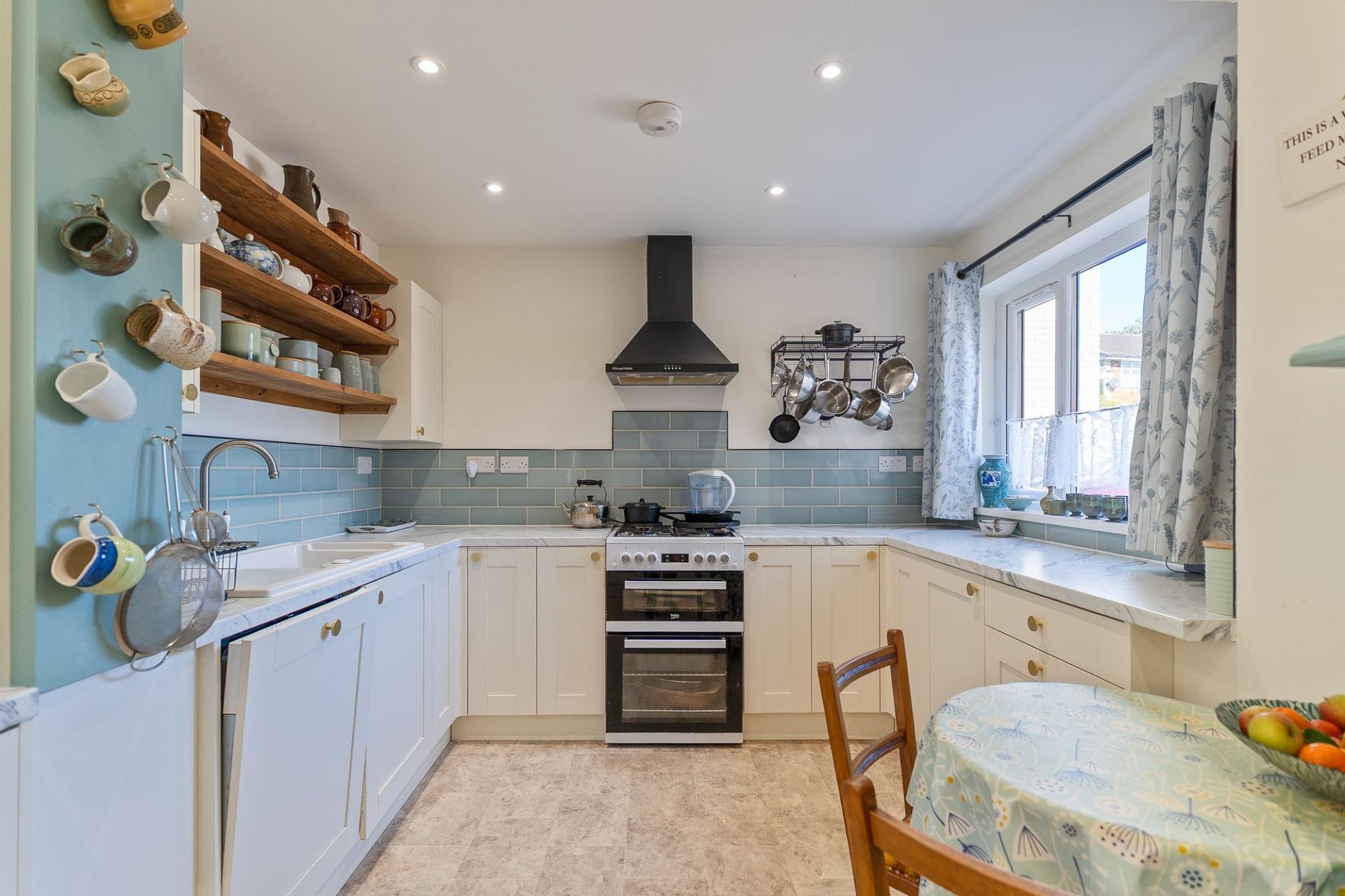 On the ground floor, the hallway provides access to the main living areas, a convenient ground floor shower room, and the staircase to the first floor. The main living space is open plan, naturally bright, and features a charming multi-fuel burner fireplace as its focal point. There is ample room for both seating and dining, creating a versatile family area. From here, access leads into the large, modern kitchen, which offers an excellent range of units and generous worktop space. To the rear of the property is a sun room, another spacious and inviting area with a large skylight and patio doors opening out to the garden. This room is ideal as a dining area or an additional family space, enjoying views over the rear garden and canal.