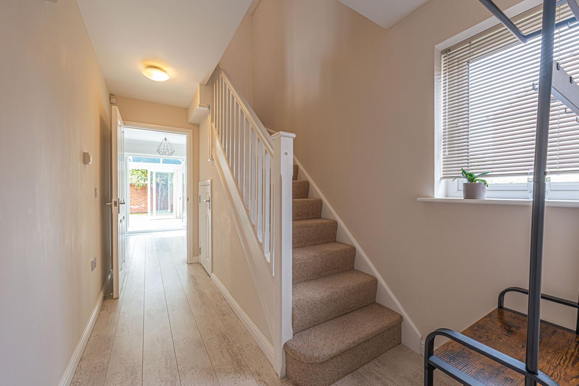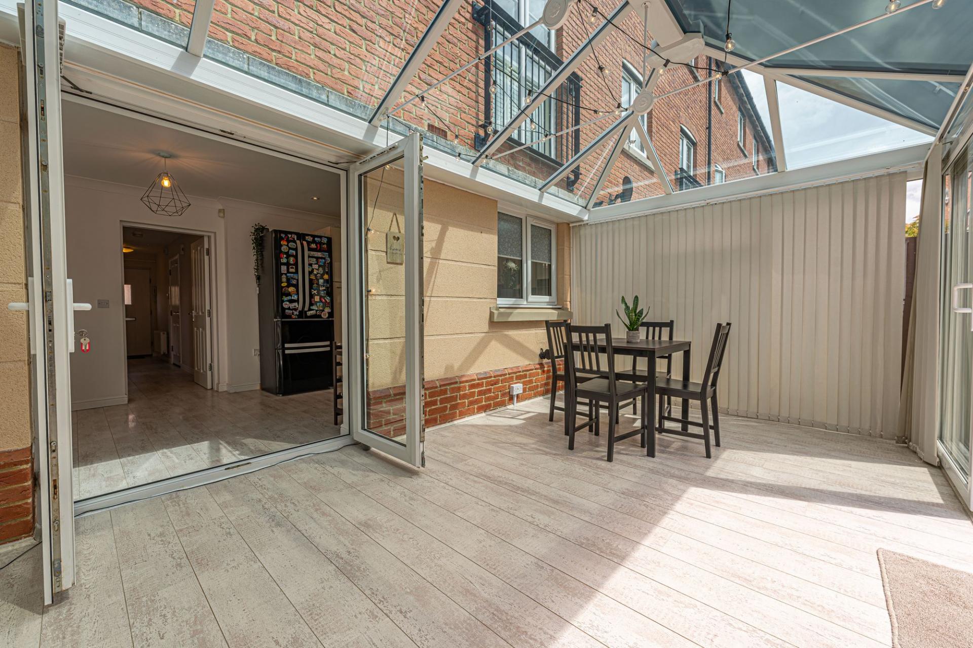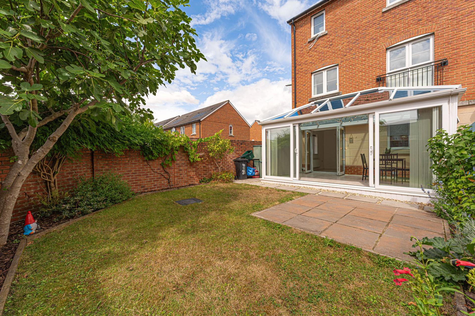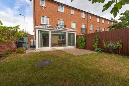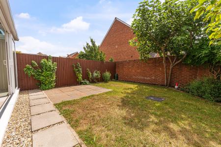 Stepping outside we have the spacious south facing rear garden with side independent access, which is fully enclosed and patio connected to the house, with a grass lawn beyond, with several shrubs and ferns to add to this tranquil outdoor retreat, which offers plenty of space to enjoy various outdoor activities. To the front of the house there is a driveway to add to the available parking, which features a stunning green space running alongside the house, providing a warm welcome for residents and visitors alike.