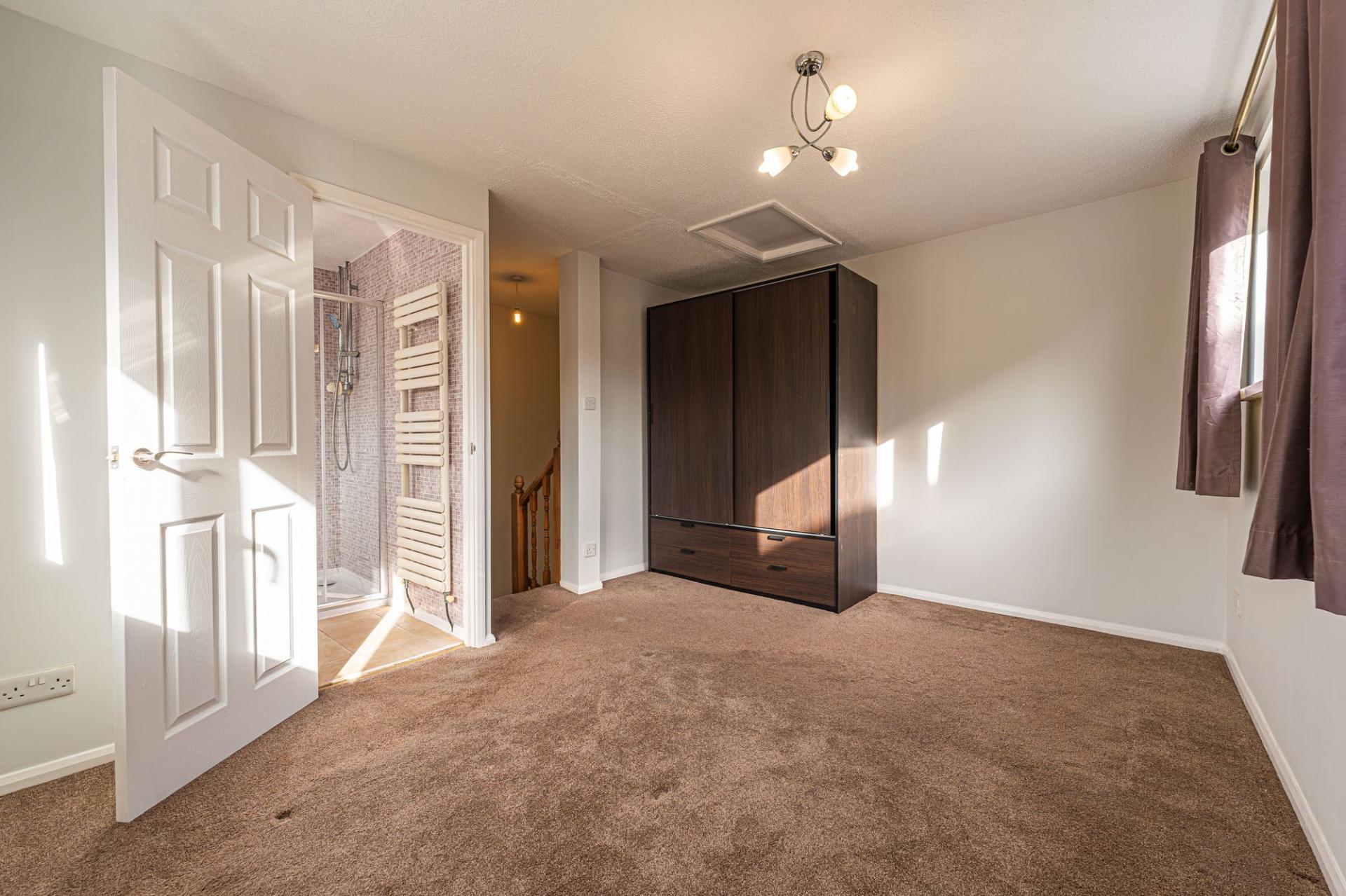 To the first floor we have the spacious double bedroom, which showcases a great amount of space and large windows to light up the room. The bedroom further benefits from an en-suite shower room, and can access the loft overhead for additional storage capabilities.