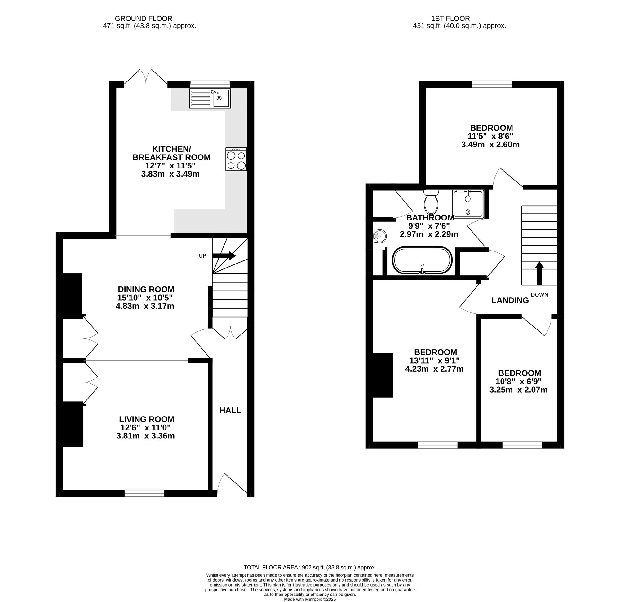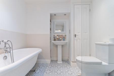 The first floor comprises three well-presented bedrooms, each naturally bright and able to comfortably accommodate a double bed. The family bathroom is generously sized and finished to an excellent standard, complete with both a walk-in shower and a freestanding roll-top bath, offering a touch of luxury.