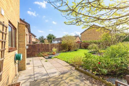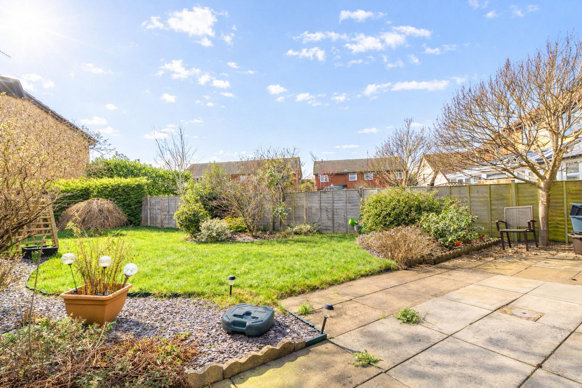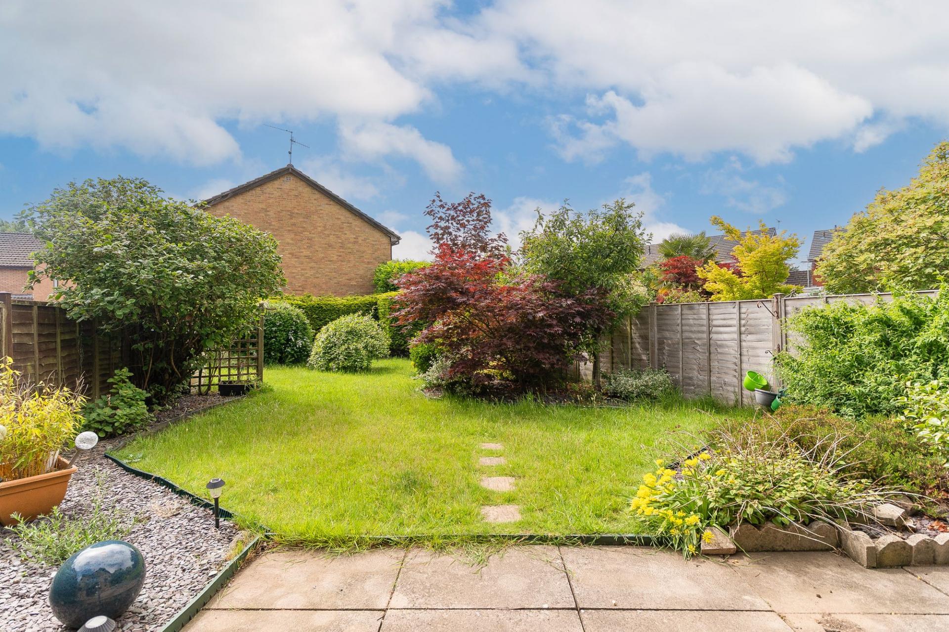 The rear garden is a true asset to the property – a great size for families, featuring a large lawn, paved patio, and established borders with mature plants and shrubs, providing a peaceful and private outdoor setting.