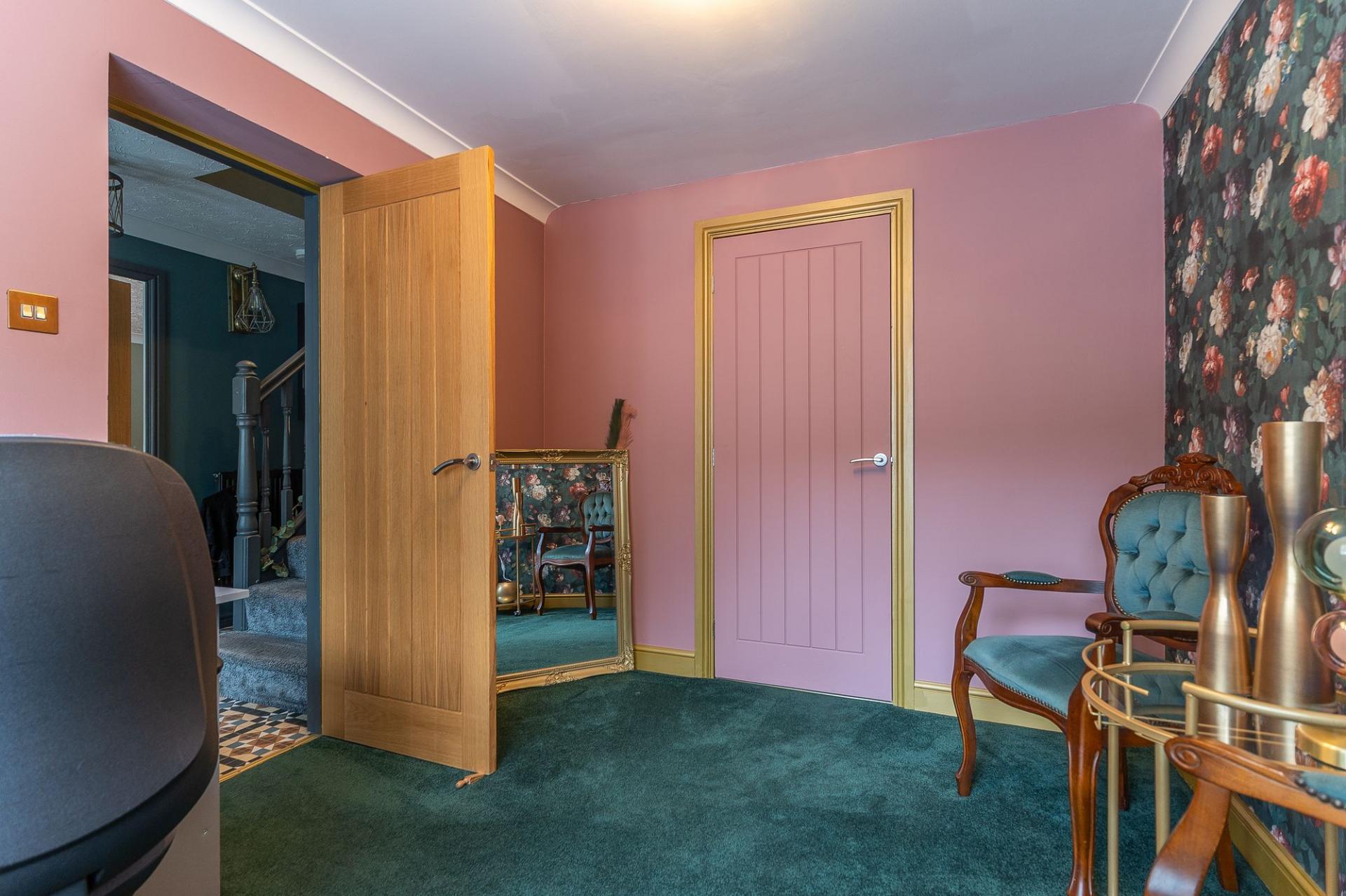 Upon entering the property, you are welcomed into the hallway providing access to the main living areas, stairs to the first floor, and a convenient cloakroom fitted with a WC and hand basin. To the left is the elegant living room, featuring a bay-fronted window that floods the space with natural light and offers ample room for a range of seating configurations, creating a comfortable and inviting atmosphere. Across the hall is the former garage which includes access to a large internal storage area.