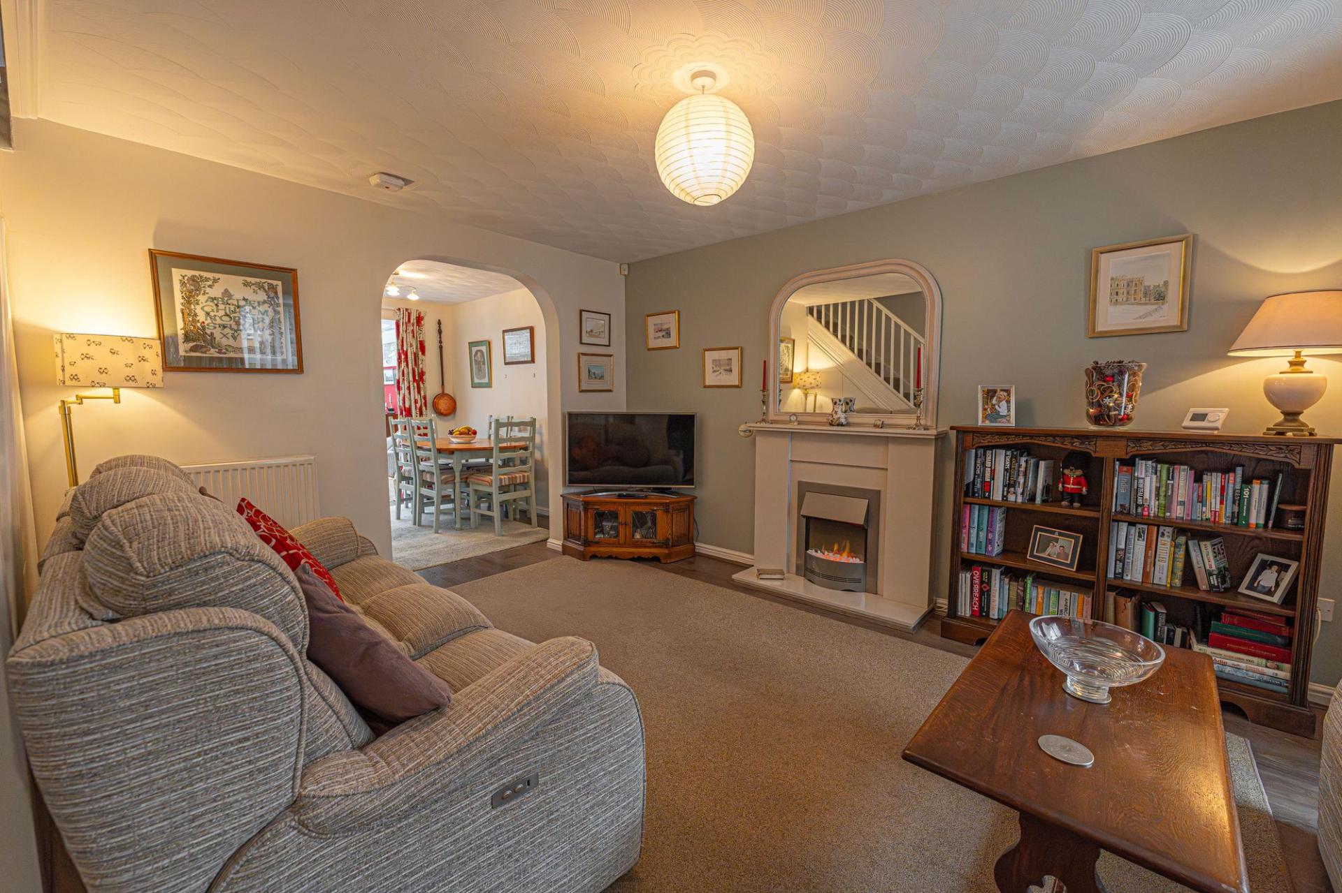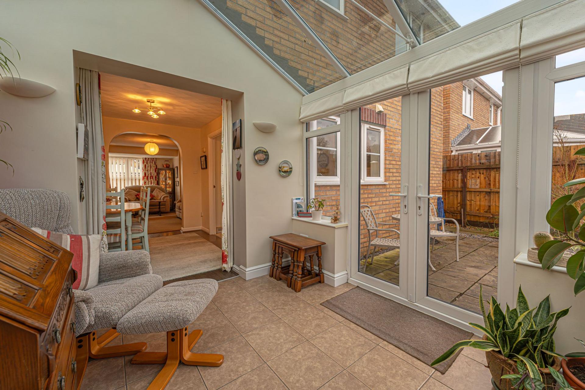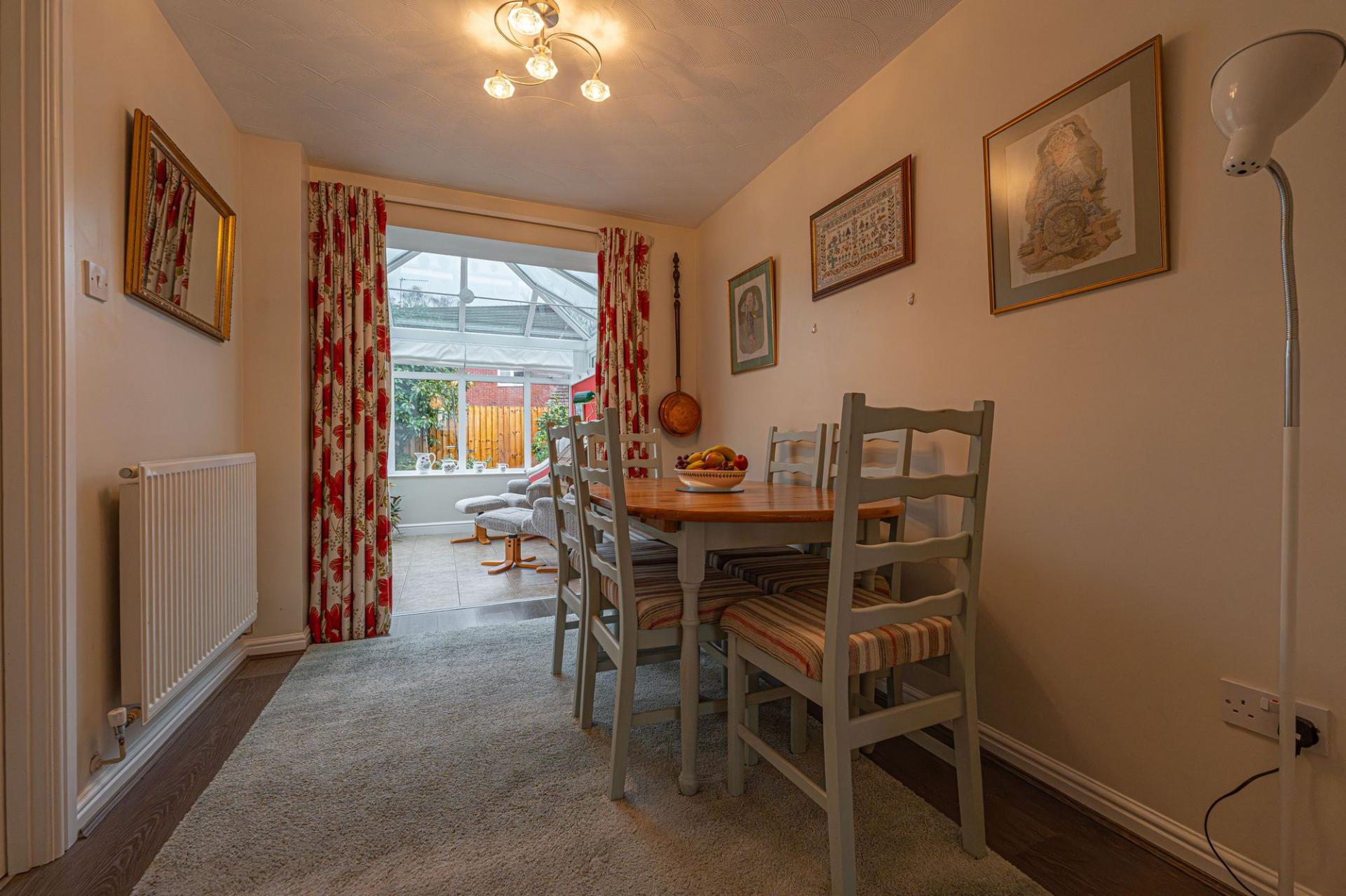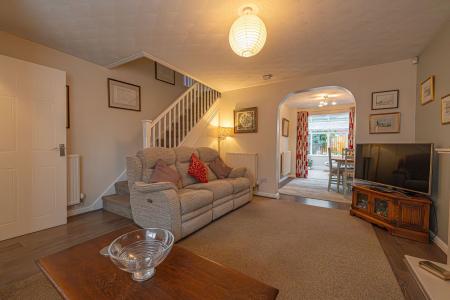 Upon entry to this beautifully presented property, we are welcomed through into the spacious living room, which features bay front windows, and serves as a great space for relaxing and entertaining guests. The living room is also complimented by an array of easy access cupboards and drawers fitted under the staircase, aswell as an electric fireplace to contribute to the warm and welcoming atmosphere. Neighbouring the lounge we can also find an open plan walkway to connect us to both the dining room and the conservatory beyond, providing easy access to both of these reception spaces. The conservatory has the added benefit of underfloor heating, and is flooded by natural light with views into the garden. The modern Wren kitchen can also be found towards the rear of the house, and is complete with ample storage fixtures and numerous integrated appliances, with a helpful utility room and sleek W.C are found next door.