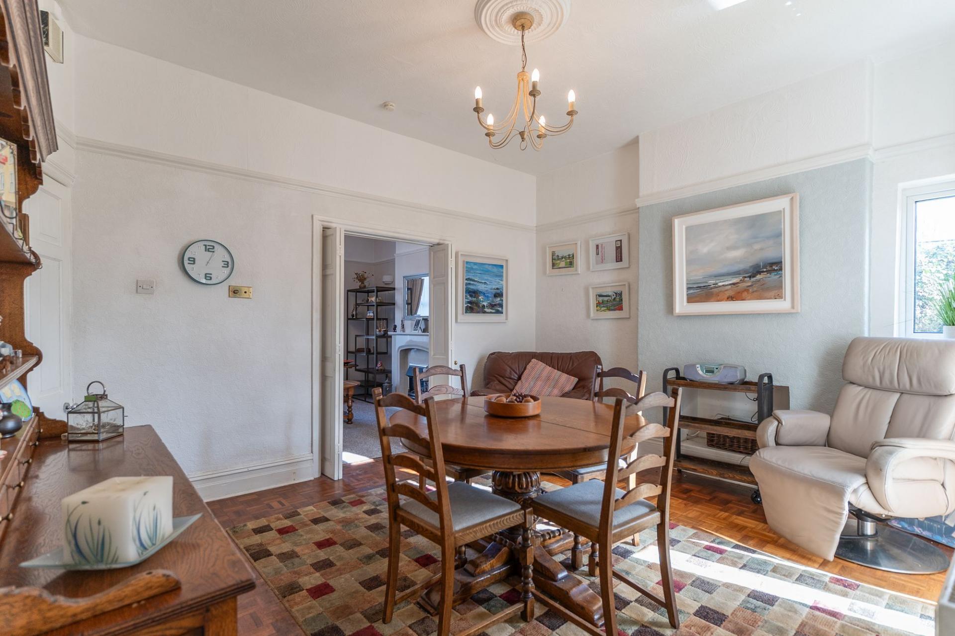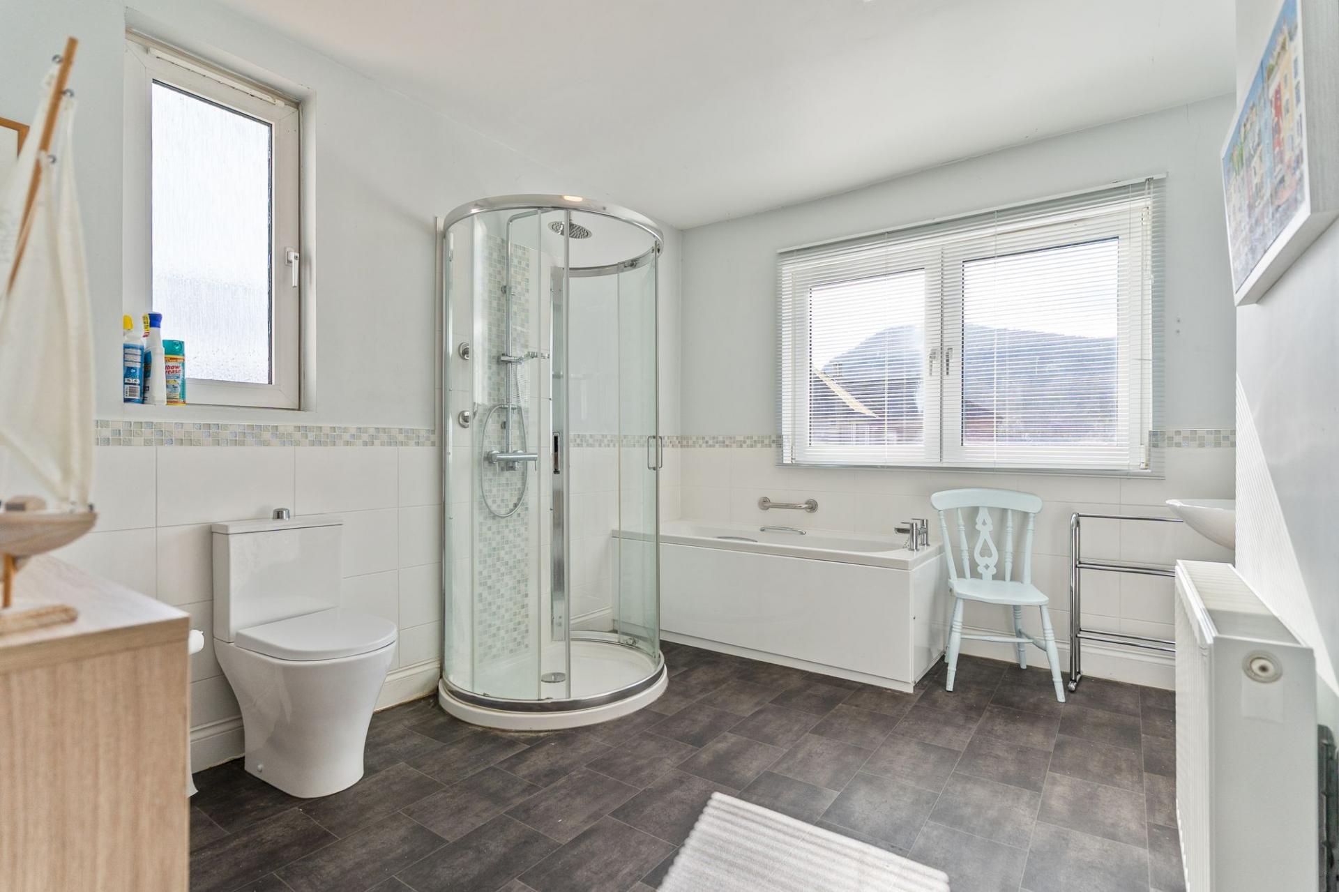 You enter the property through a welcoming hallway, with access ahead to the first floor and into the main living space. The ground floor offers a generous and versatile layout, comprising a living room and dining room connected via bi-fold doors. The living room features a bay-fronted window allowing for plenty of natural light, while patio doors from the dining area open out to the rear garden, creating an excellent flow for entertaining. To the rear of the property is a spacious and naturally bright kitchen, fitted with a good range of wall and base units and offering ample space for additional seating or dining. There is also access to a washroom/shower room which is conveniently located off the kitchen.