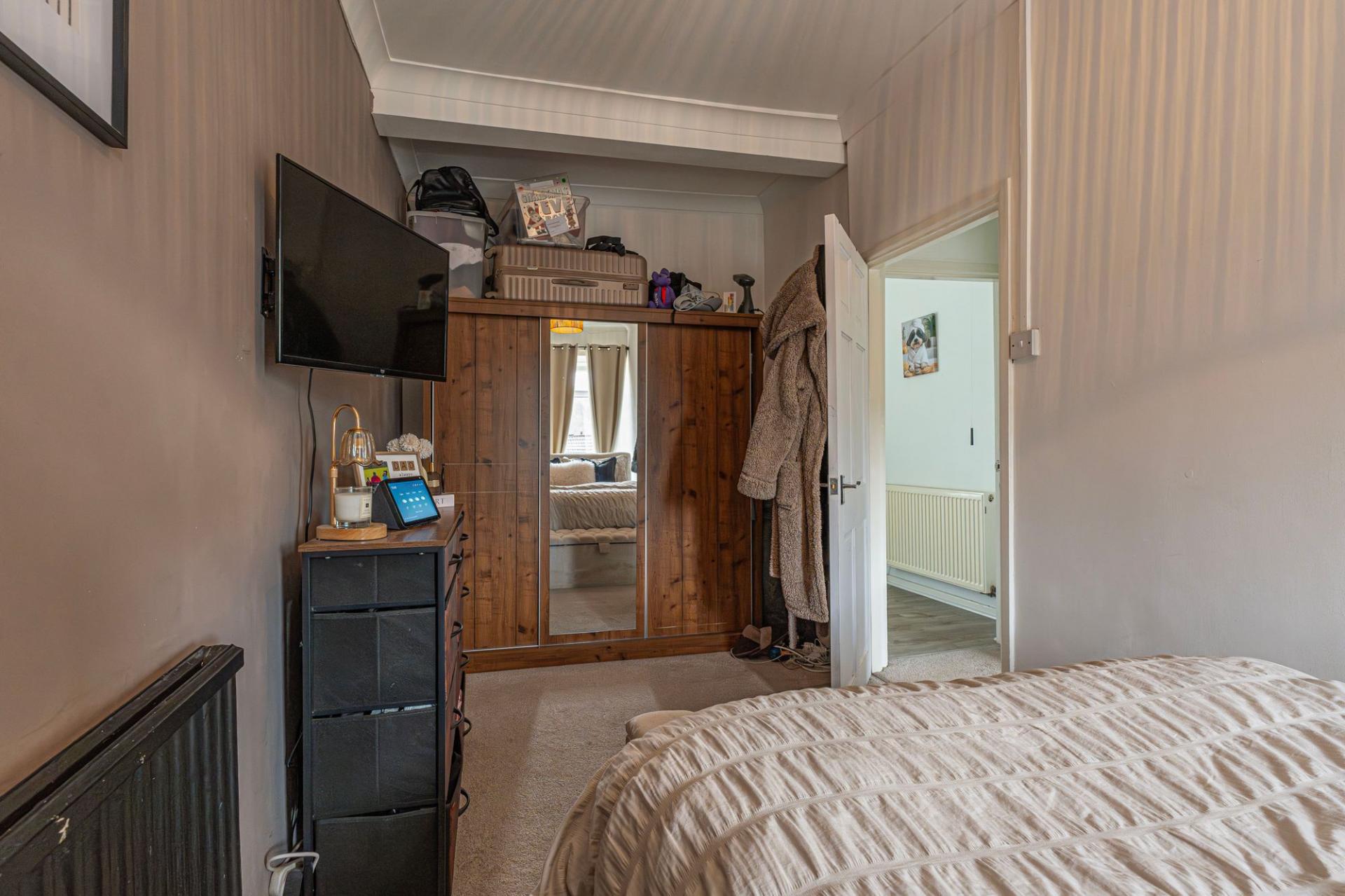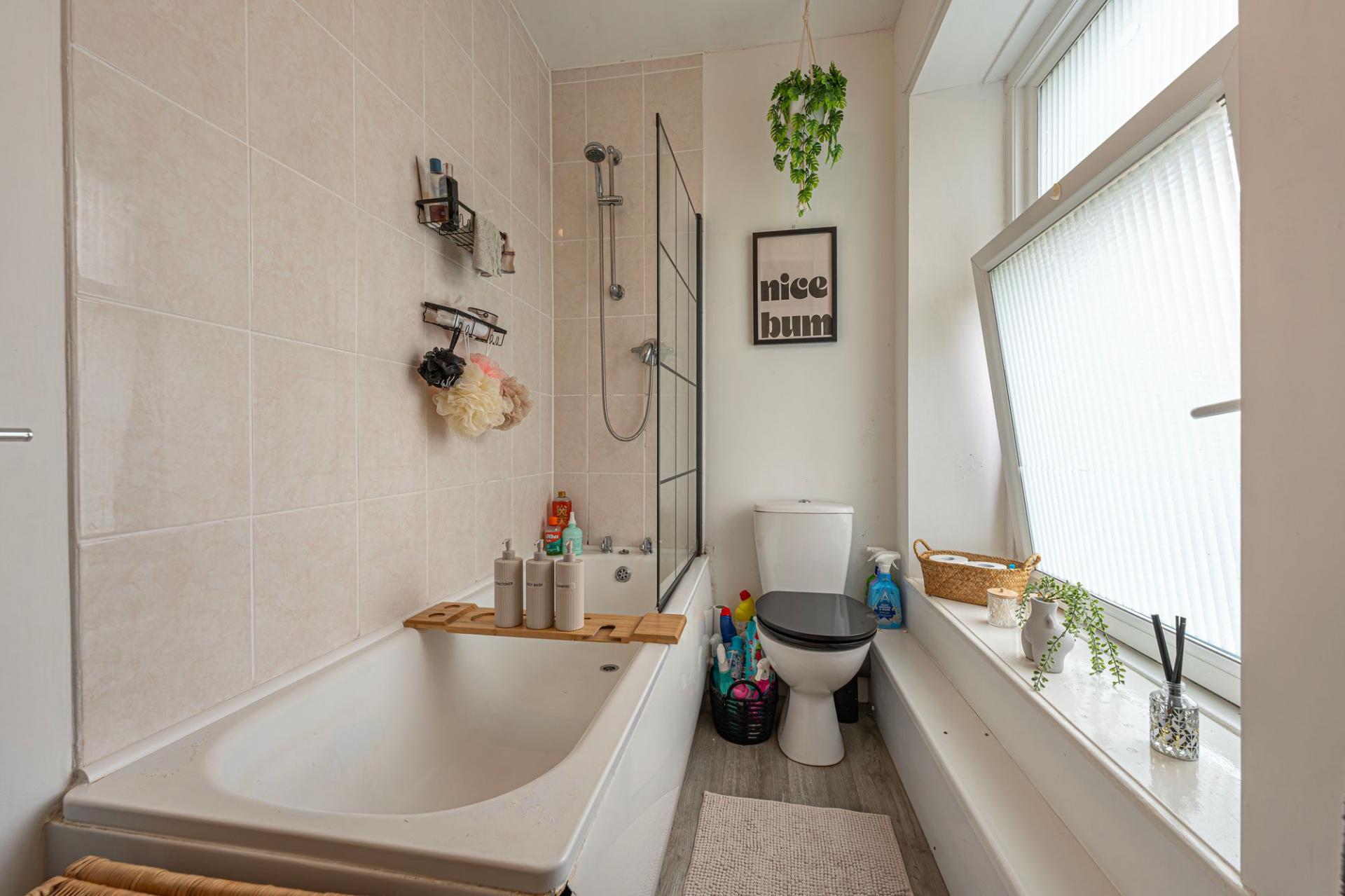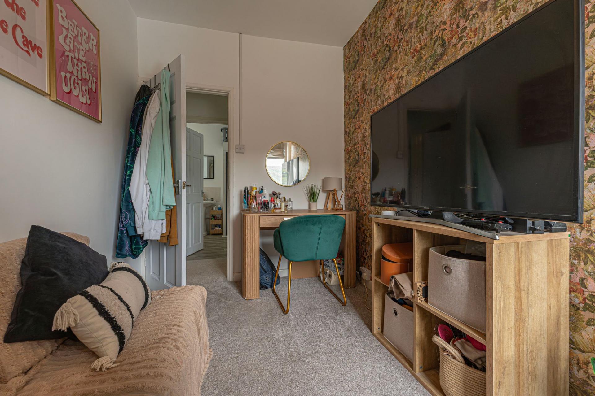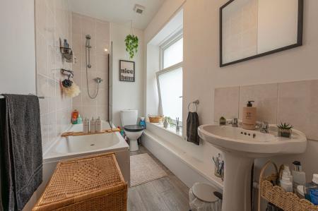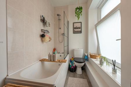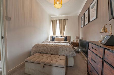 To the first floor we have two bedrooms, one of which is a well sized double room whilst the other is a comfortable single, with great application for a home office, dressing room or a nursery. From the hallway we can find the family bathroom, featuring a bath suite, overhead shower, and a fitted airing cupboard housing the boiler.