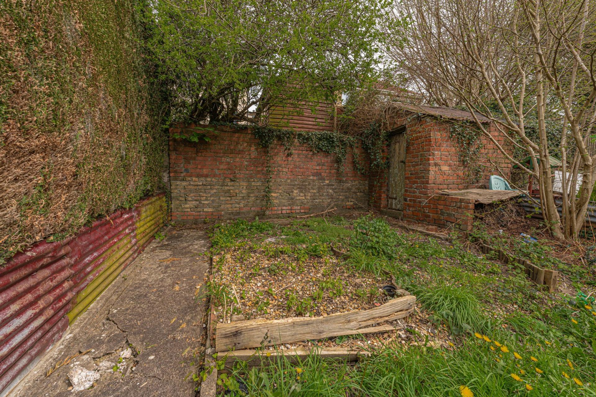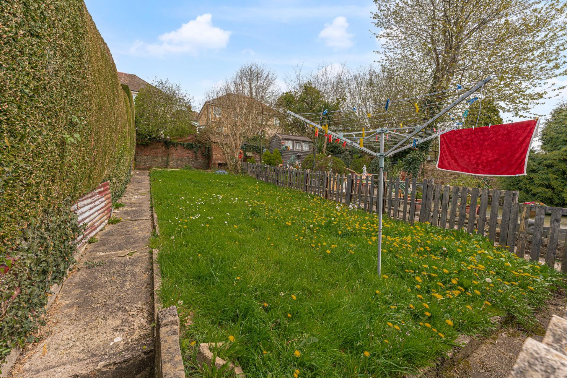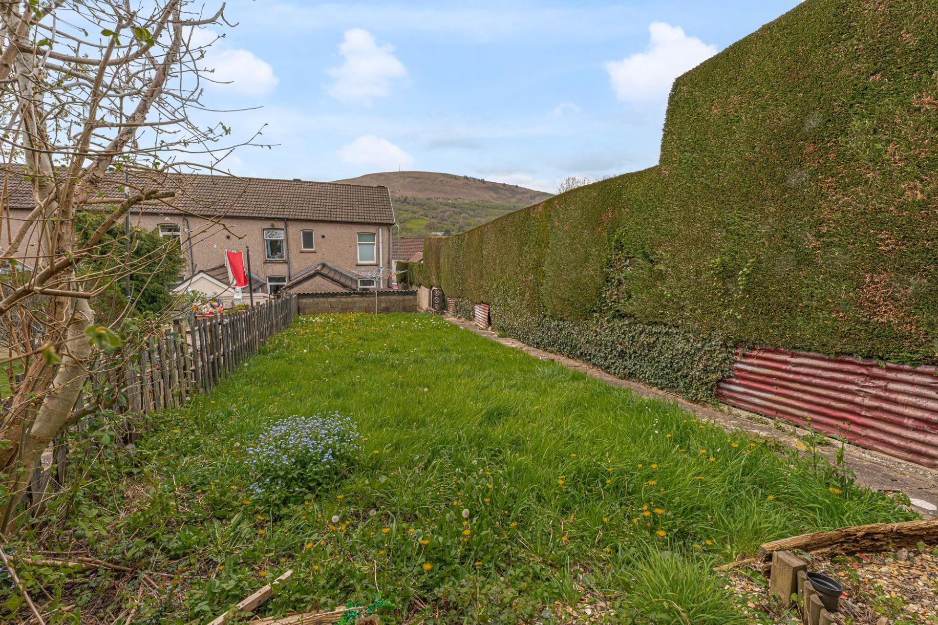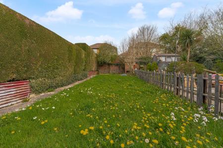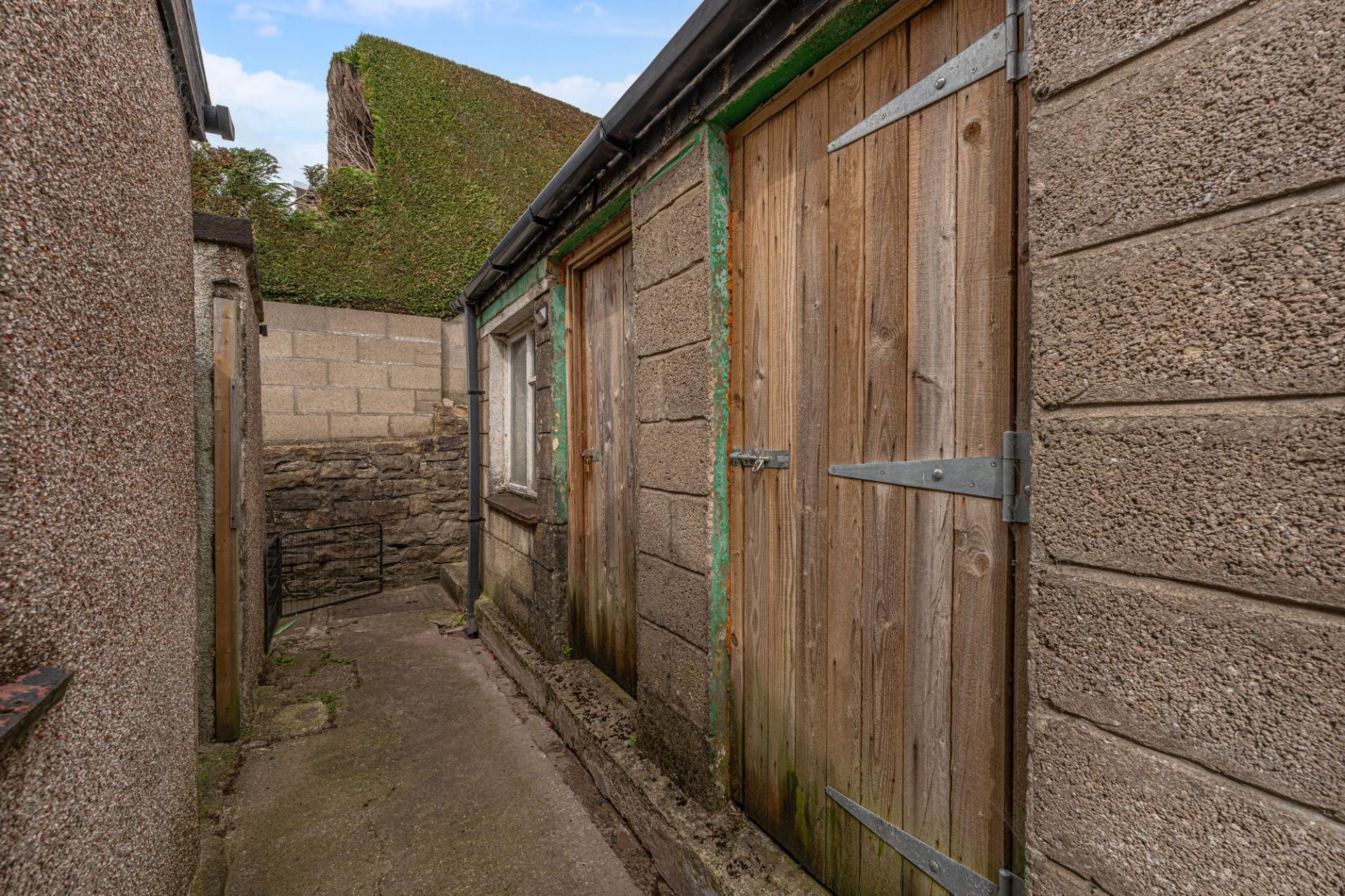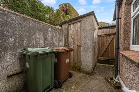 Stepping outside we initially arrive at the secluded courtyard, ideal for bin storage and offering a storage outbuilding, with an additional two sheds on the other side of the gate, providing an incredible degree of storage for residents to enjoy. From here we can find a short staircase to the main garden retreat, which features a partially sizeable grass lawn offering plenty of outdoor space for lounging in the sunshine and entertaining guests, with a tall hedge providing partial enclosure, and views of the surrounding hills peeking over the house.