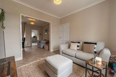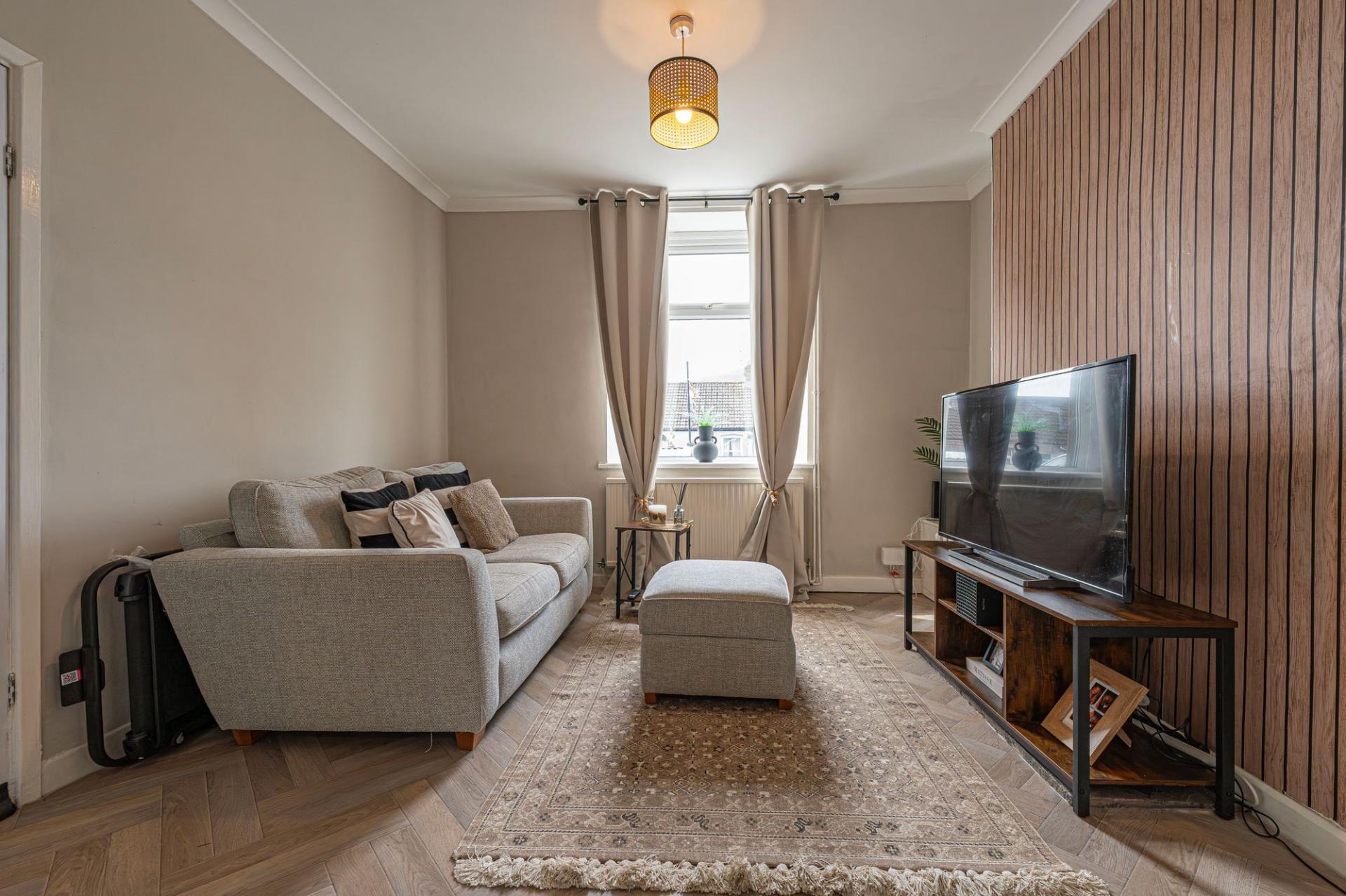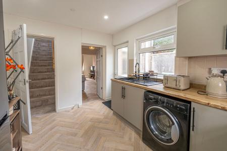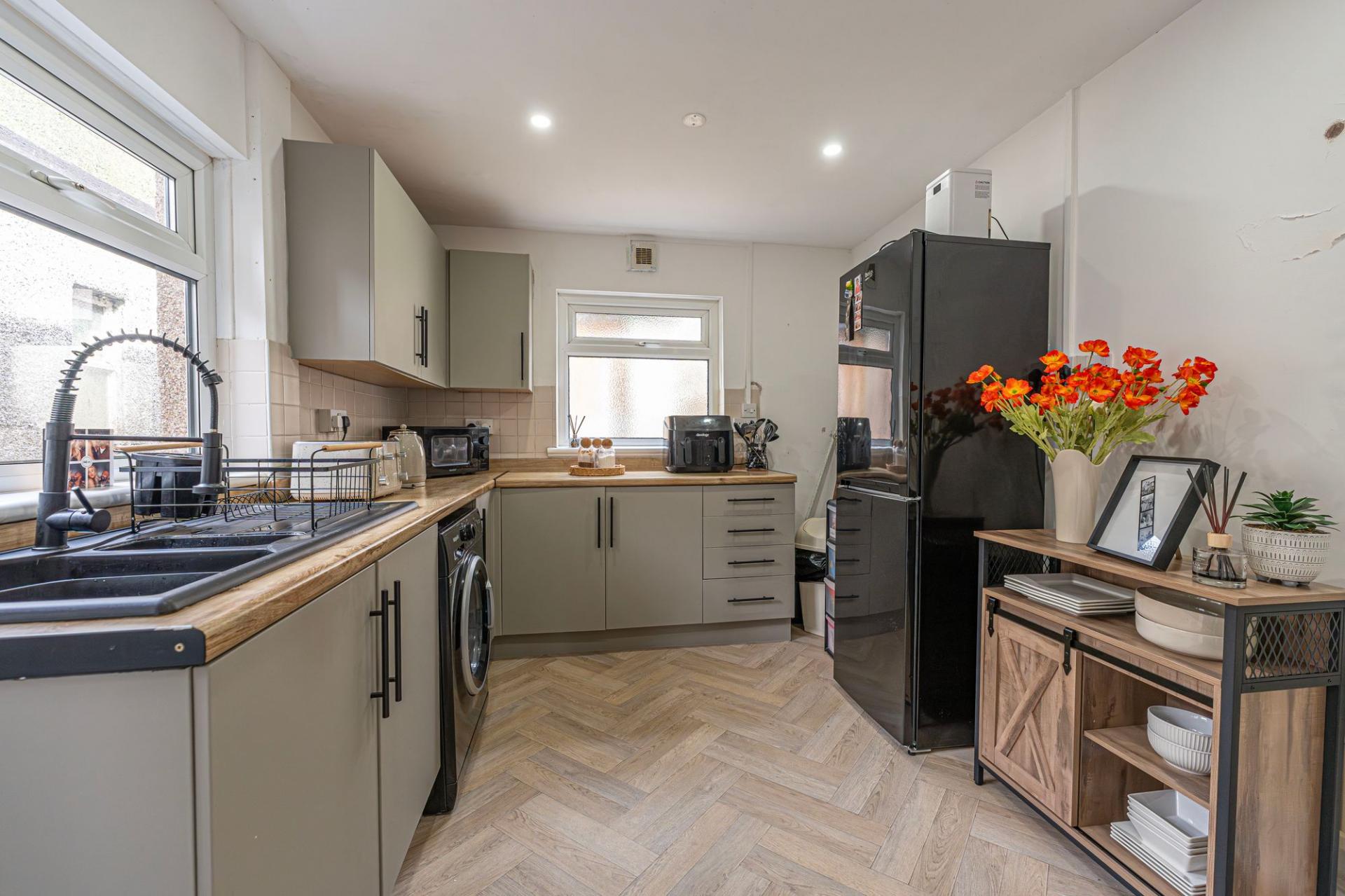 Inside this beautifully presented family home we have two spacious reception rooms, connected by a fluid open plan design, highlighting a great space for relaxing, dining and entertaining guests, with the entire space flooded by natural light by multiple windows. To the rear of the house we have the sleek modern kitchen, featuring numerous storage fixtures, and plenty of space for appliances to be added, with a doorway to the garden and the staircase upstairs. The ground floor also features a fitted cupboard from the entry hall, ideal for a cloakroom and other general storage.