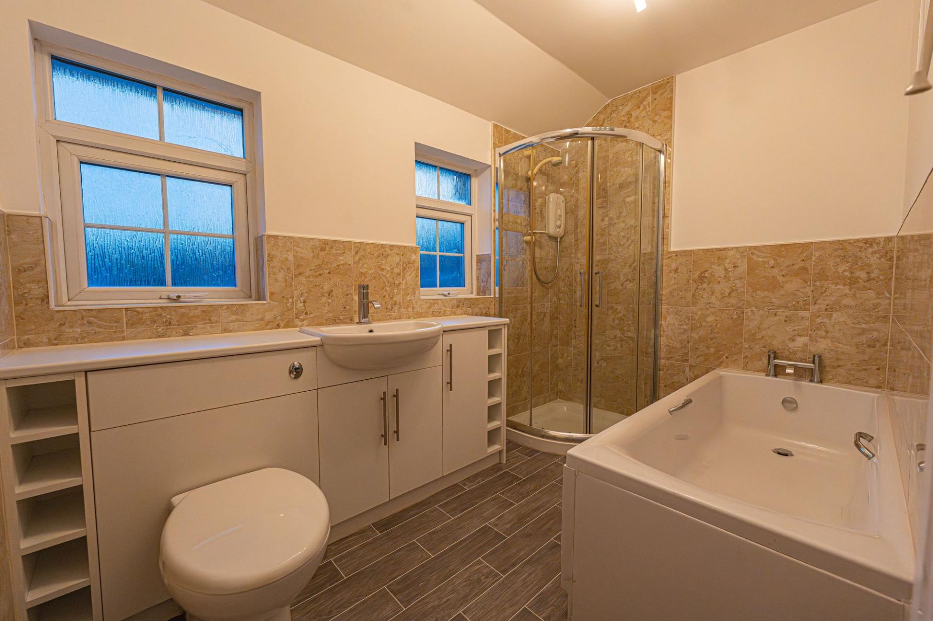 Ascending upstairs we have three bedrooms, which can all accommodate double beds, while two of the bedrooms are equipped with fitted storage, including the principal suite which benefits from an entire wall of wardrobe space. From the landing we can find the boiler cupboard and another family bathroom, which offers both a bath suite and a separate shower unit, in addition to a toilet and vanity storage.