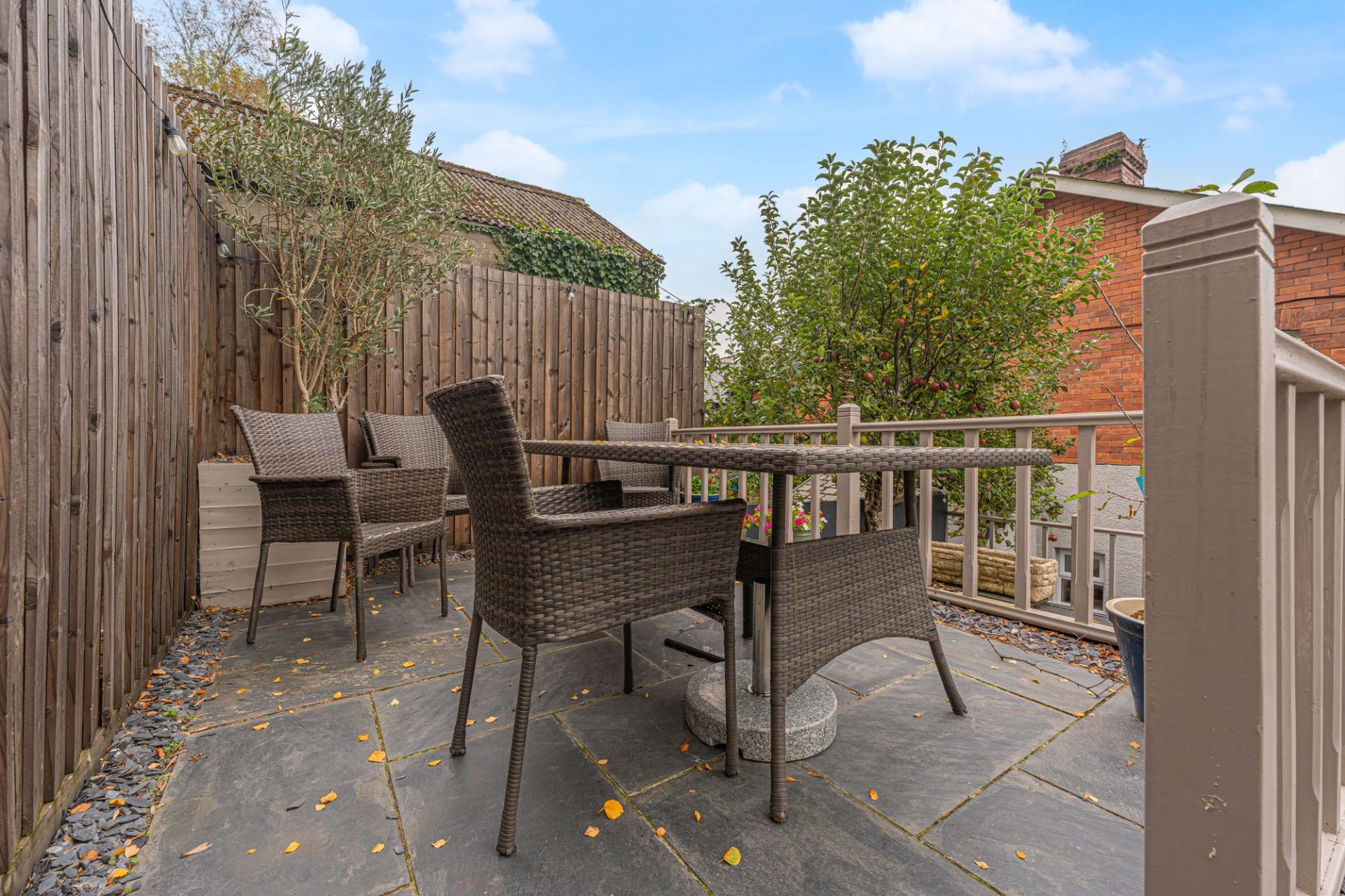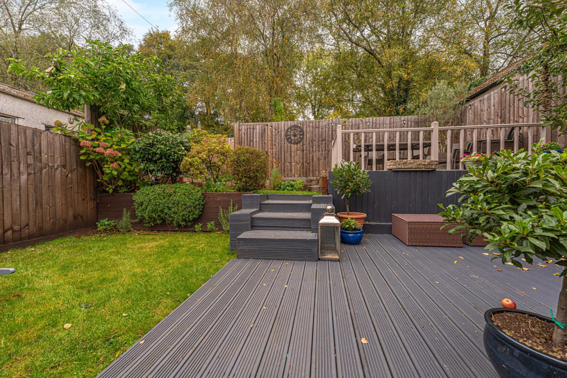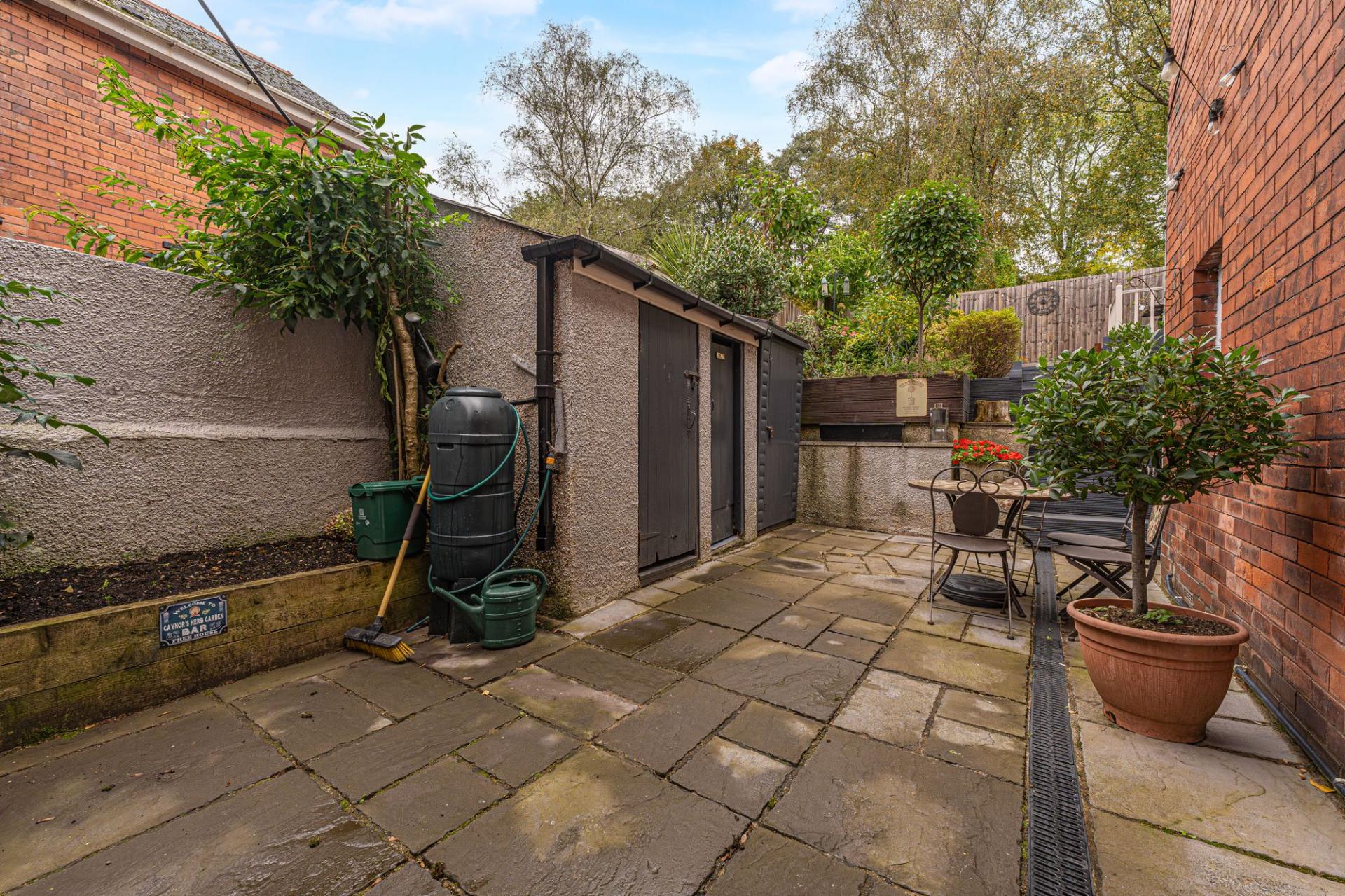 Stepping outside we arrive at the fabulous rear garden, which has been landscaped to a high standard, while offering an variety of spaces that are perfect for lounging and entertaining guests. From the house we can find a large patio which connects to an outbuilding with both storage and an external W.C. Above the patio there is a multi-layered lawn and decked seated area, offering an abundance of space for activities, while the entire garden is adorned by a beautiful array of shrubs, flowers and mature trees, including several bearing fruit throughout the year. This extravagant garden is truly a private haven, and is ideal for relaxing at the end of a long day, with immediate access to the garden when returning home from the carport, with room to park a single vehicle from the lane behind the property.