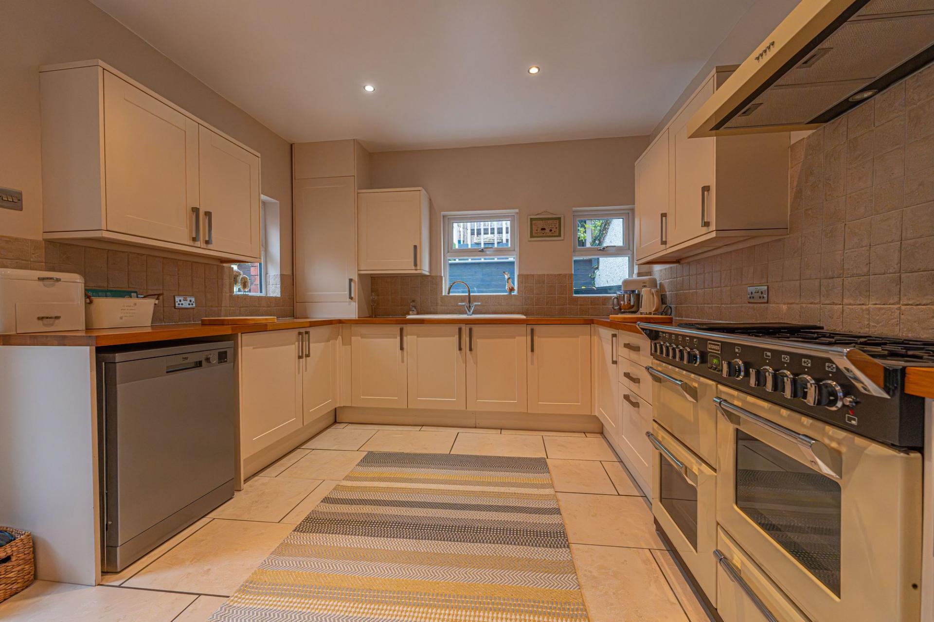 This beautifully presented Victorian-style house offers an exquisite blend of period charm and modern functionality, making it the ideal family home. The property welcomes you with distinctive red brickwork, ornate architectural details, and a disability friendly ramp alongside the steps up to the house. Inside, we can find two generously proportioned reception rooms from the hallway, featuring elegant wooden flooring, and each found with a fireplace, providing attractive and versatile spaces that are well suited to relaxing and entertaining. Both reception rooms are also bathed in natural light, with classic bay windows to the front room, while the other offers French doors that open out to the garden. At the rear of the house is a stunning modern kitchen, boasting ample storage and counter top space, and plenty of room for appliances to join the integrated range cooker. The kitchens open plan design offers a great flow, leading towards a wonderful dining area adjacent, while another set of French doors light up the room, as well as providing further access to the garden.