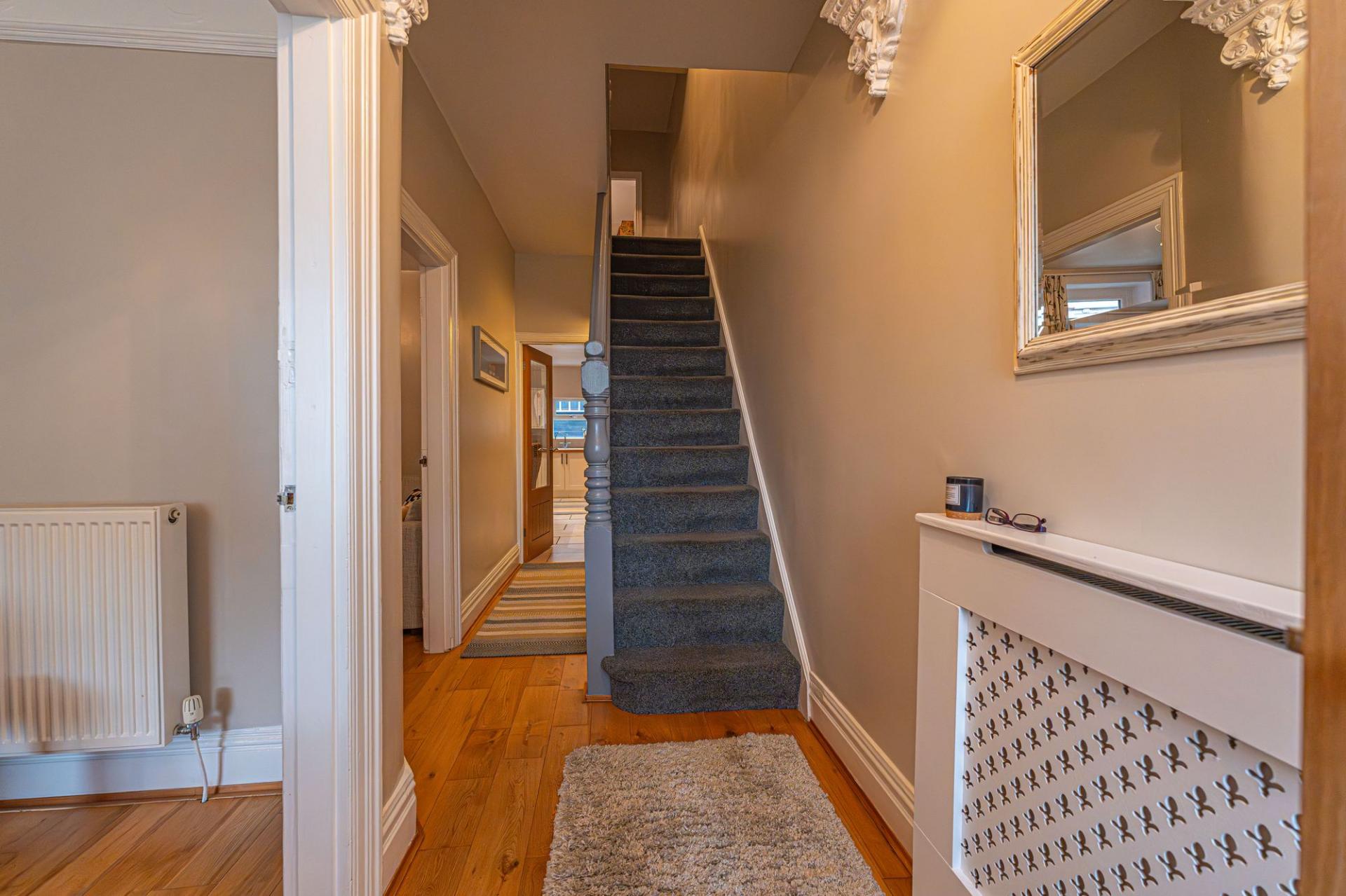 Ascending to the first floor we can find four bedrooms, three of which are generously sized double rooms that are flooded with natural light, with particular mention of the principal suite, which enjoys the luxurious bay windows of the floor below. The final bedroom is a cosy single room, which could also suit well as a home office, dressing room or nurser, while the prestigious family bathroom is found from the hallway with a freestanding clawfoot bath, in addition to a separate walk-in shower with contemporary tiling.