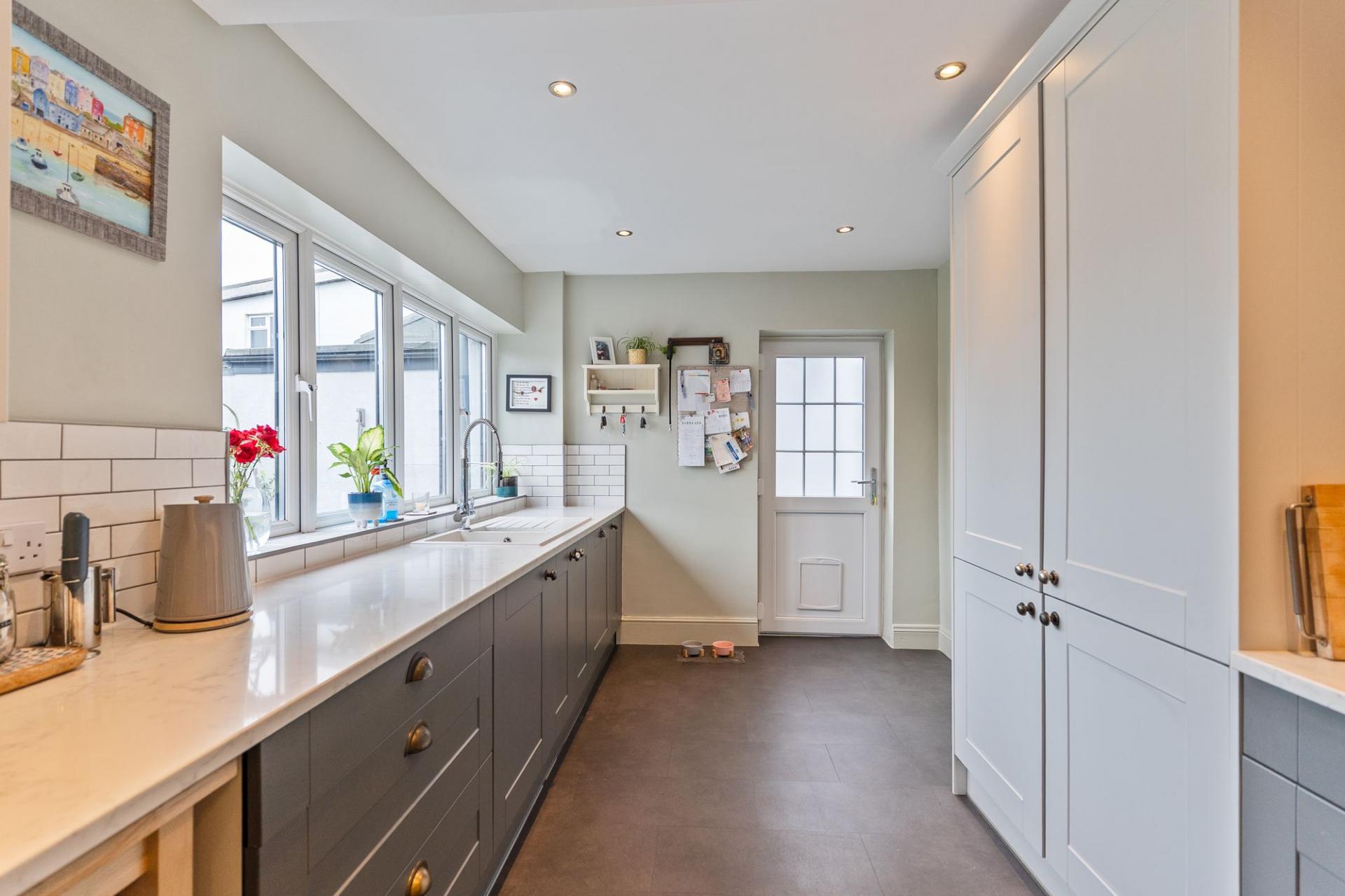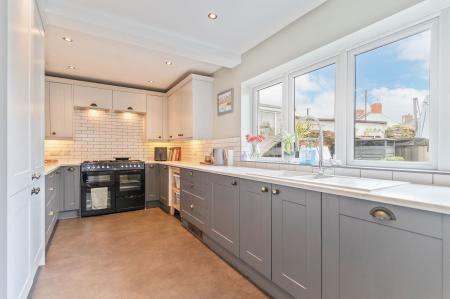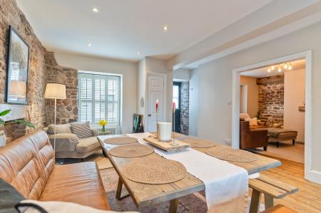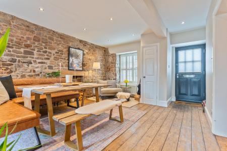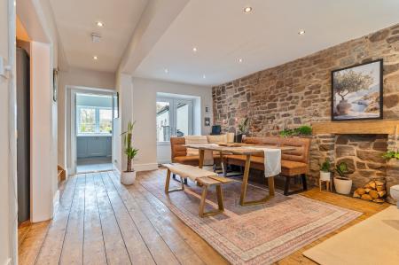 You enter directly into the stylish open-plan main living area, which immediately showcases the character and charm of the home. The spacious dining room features exposed stone walls and offers ample room for family dining and entertaining, with open-plan access to the cosy lounge. The lounge provides a warm and inviting atmosphere, centred around a feature log burner fireplace. From here, a hall space leads to a convenient ground floor cloakroom, the staircase to the first floor and through to the kitchen. To the rear, the large cottage-style kitchen is fitted with a range of floor and wall units, offering excellent storage and workspace, with a large window overlooking the rear garden and allowing for plenty of natural light.