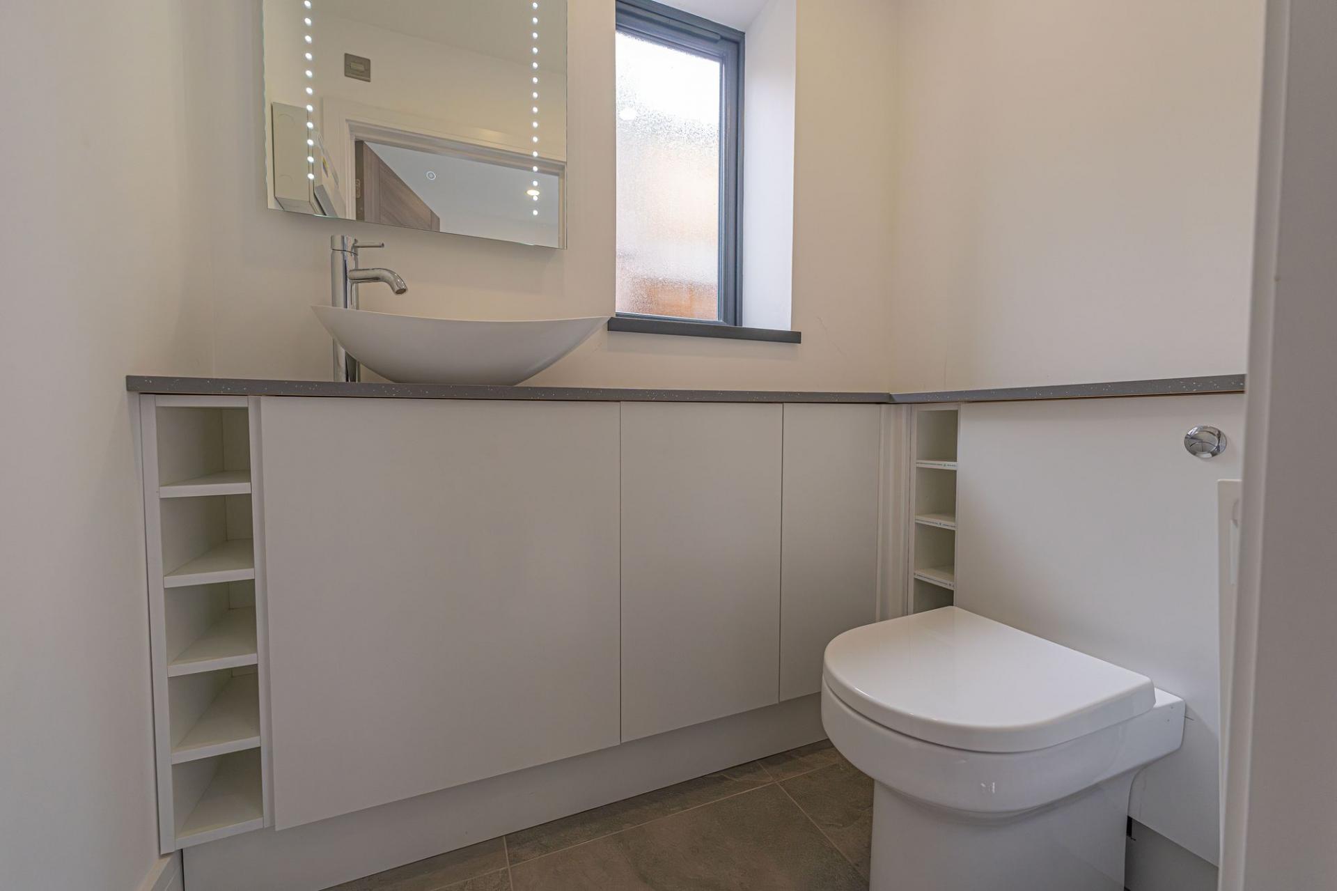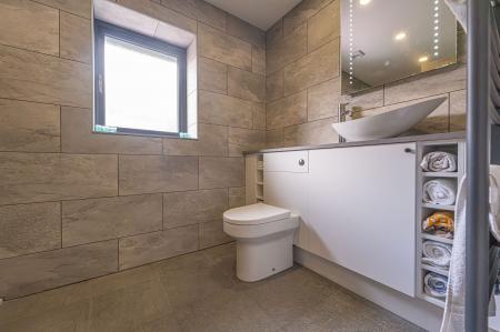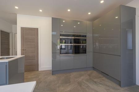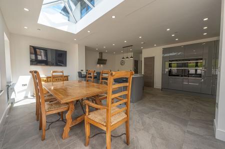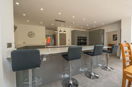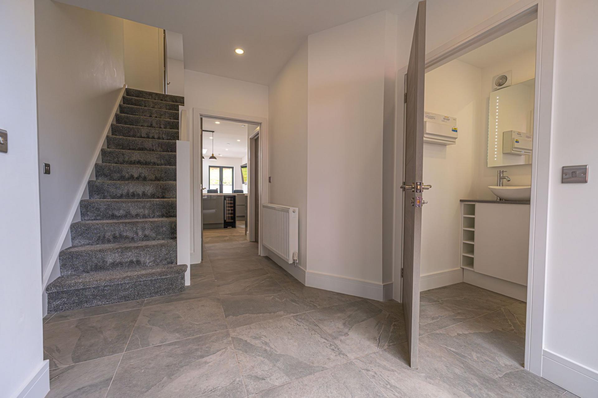 This magnificent property is presented to an outstanding quality throughout, offering a high standard of contemporary living. Upon entry to this incredible family home, we can find a W.C from the entry hallway, as well as the spacious living room, which is flooded with natural light, and offers an ideal space for relaxing and welcoming friends and family. Continuing through the home, we arrive at the impressive kitchen and dining room, with both spaces sharing a glorious open plan design to promote a fluid user friendly experience. The kitchen itself is incredible sleek and practical, with an abundance of counter space, storage options and many high-end appliances integrated into the worktop. The kitchen also features a sizeable breakfast bar, in addition to a glorious dining area, with numerous windows with a view of the garden, and an overhead skylight to allow sunlight to cascade throughout the room. From the kitchen we can also access an understairs storage cupboard, a fantastic utility room, and a further reception room, which would be ideal for a home office, or another snug living room.