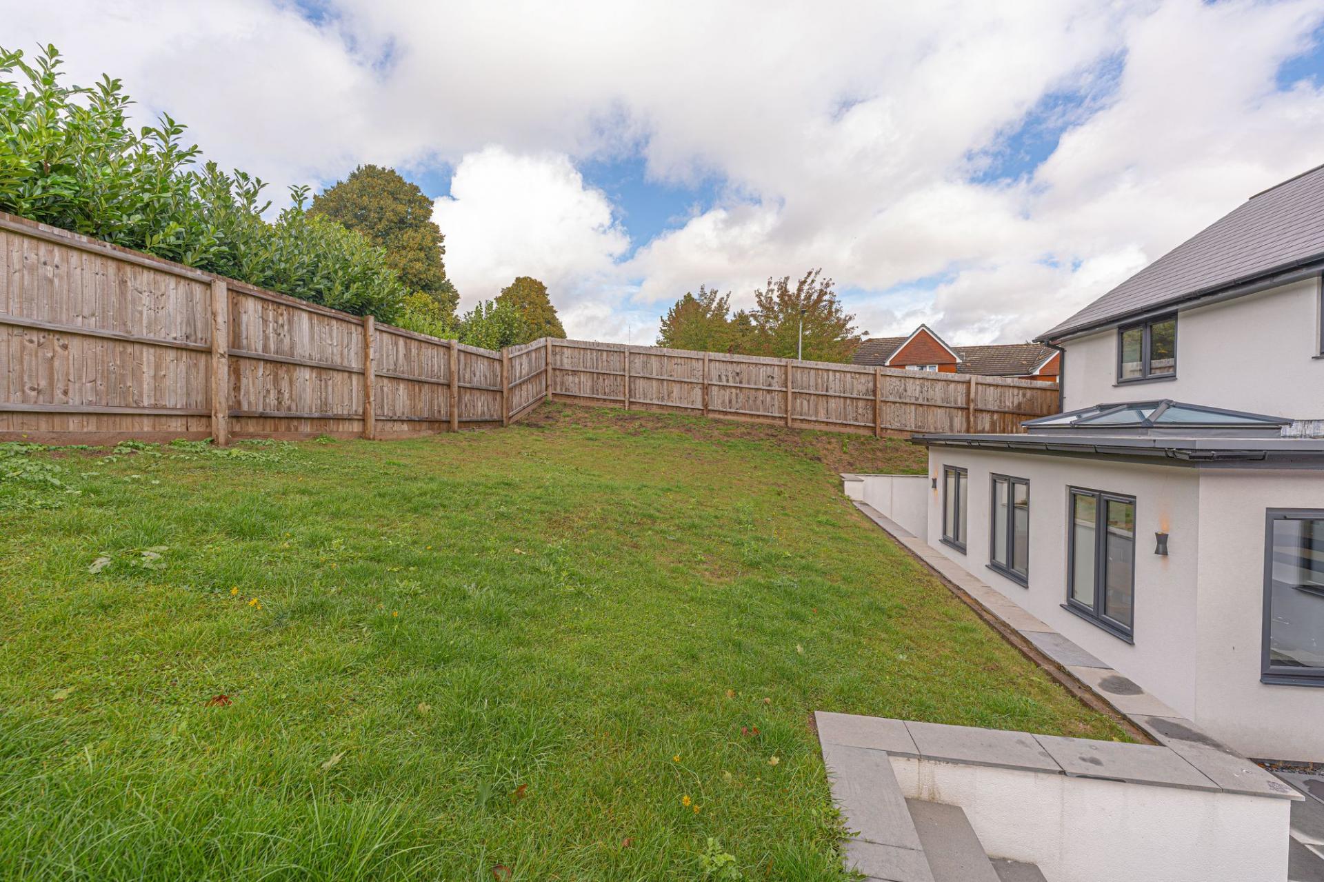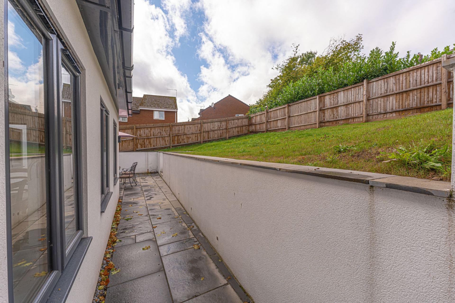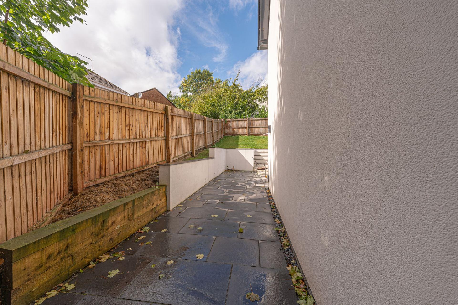 Stepping outside we arrive at the glorious rear garden, which is completely enclosed and offers an abundance of space for residents to enjoy, with a grand patio space surrounding the house, with steps up to a sizeable grass lawn beyond. This impressive garden plot is a real highlight of the property, and is perfect for relaxing in the sunshine, and welcoming guests for a wide variety of activities, such as al-fresco dining, family games and garden parties. The property also features a large driveway to the front of the property, which can park at least 2-3 vehicles, tucked away on a private plot with secure gated access from the main road.