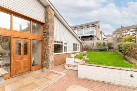 Externally, the property is set on a generous plot with extensive outdoor space. To the front, a large driveway provides ample off-road parking and leads to the garage. The property is surrounded by well-maintained gardens on both sides, featuring lawns, mature planting, and multiple seating areas, perfect for outdoor dining, entertaining, or simply enjoying the beautiful surroundings and views.