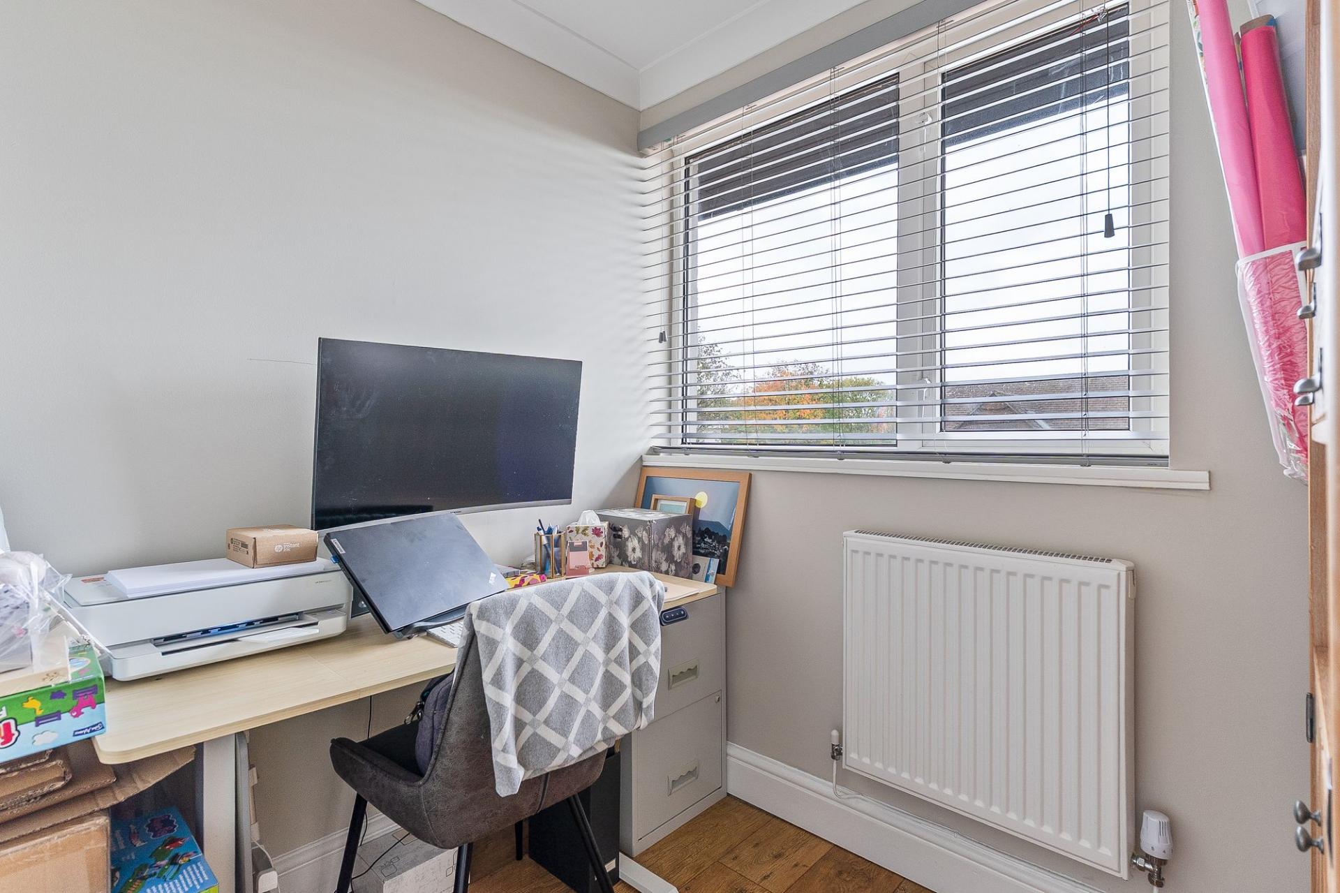 Stairs lead down to the lower level, where you’ll find a shower room, utility area, and integral access to storage and garage space. This floor also features a large double bedroom with built-in storage and access to a study, offering flexibility for use as a private guest suite, home office, or teenage retreat.