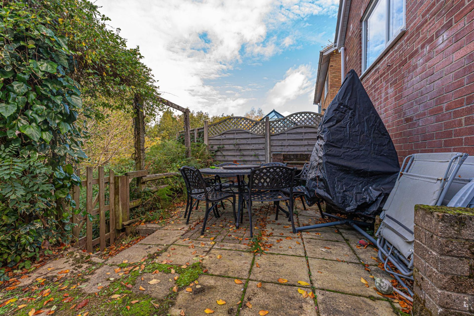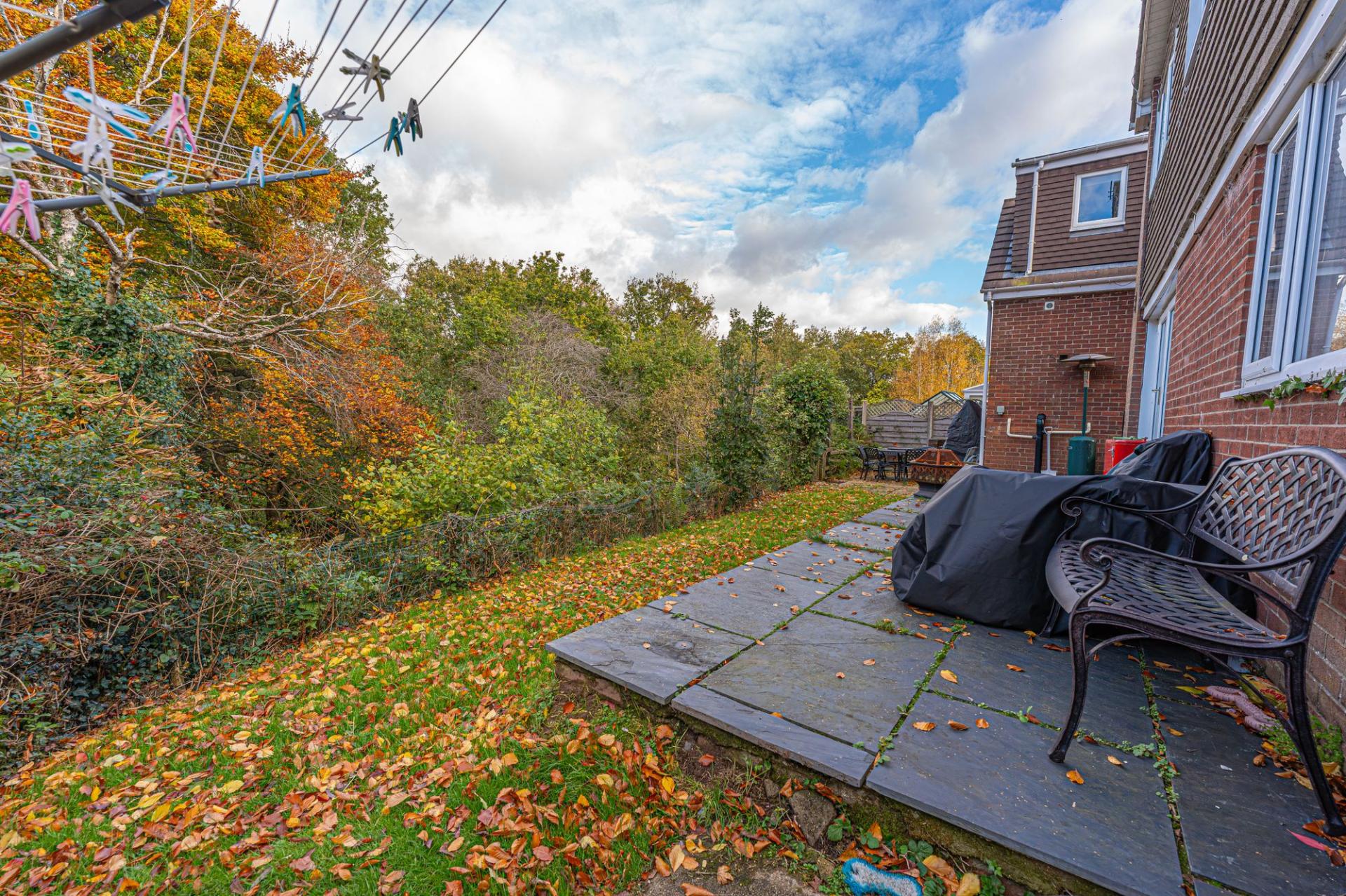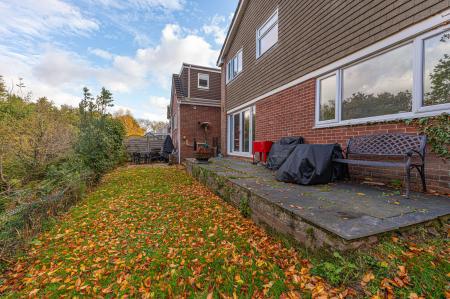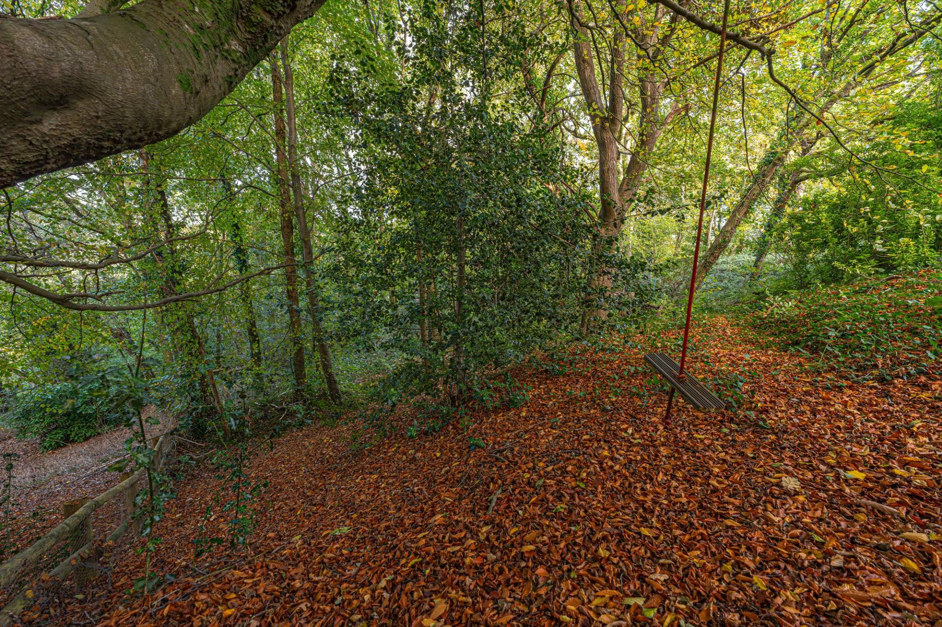 Stepping outside we have the spacious rear garden, which features multiple patio areas and a large lawn, ideal for relaxing in the sunshine, and welcoming guests for tea/coffee or dining al-fresco style. The grounds are framed by mature trees beyond, with the property having the unique benefit of a private woodland area totaling around 1/3 of an acre, highlighting an superb rural space to escape into. The front of the house can be found with a large lawn and an extensive driveway providing ample off-road parking for multiple vehicles, ensuring convenience for families and guests.