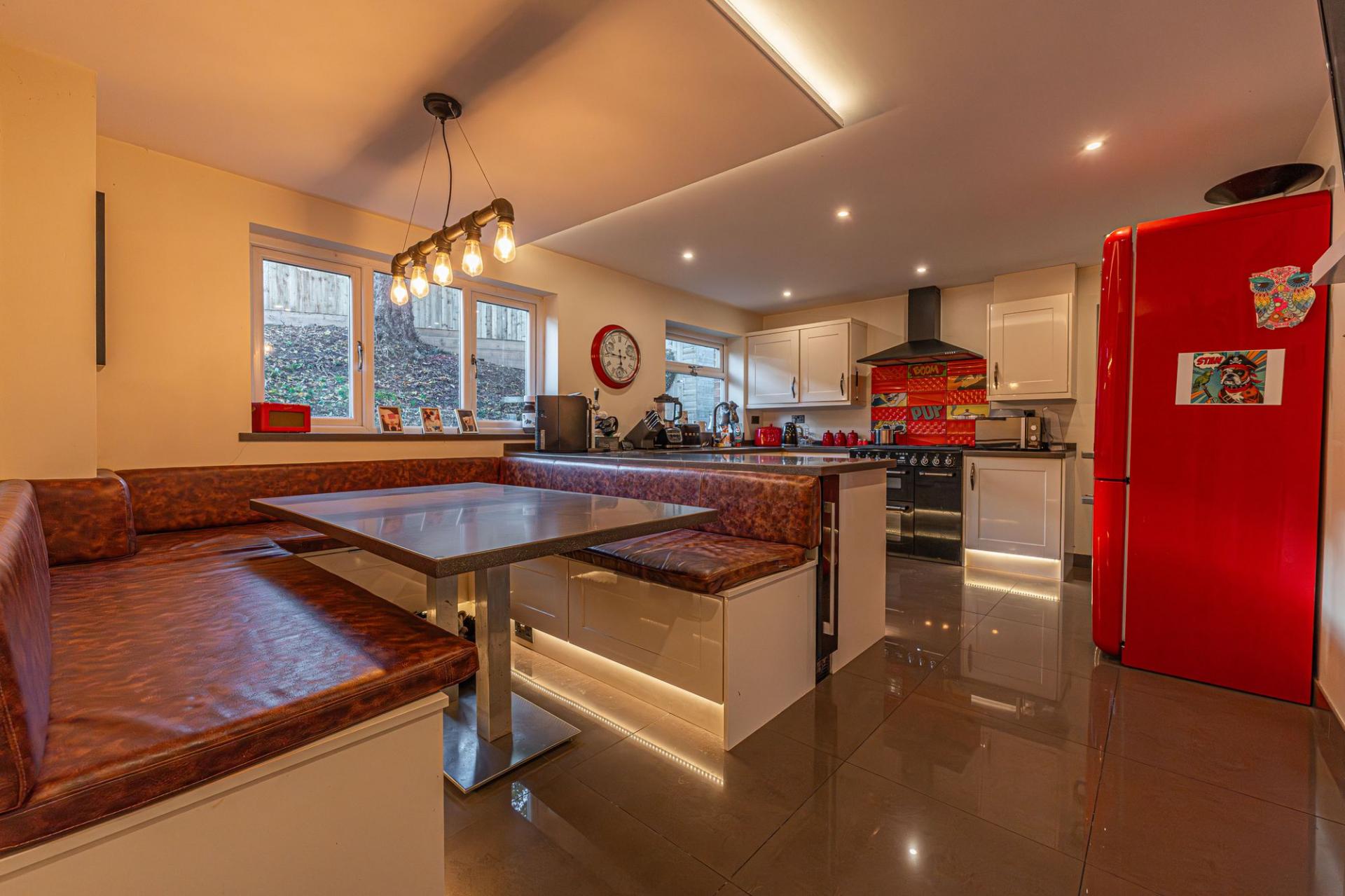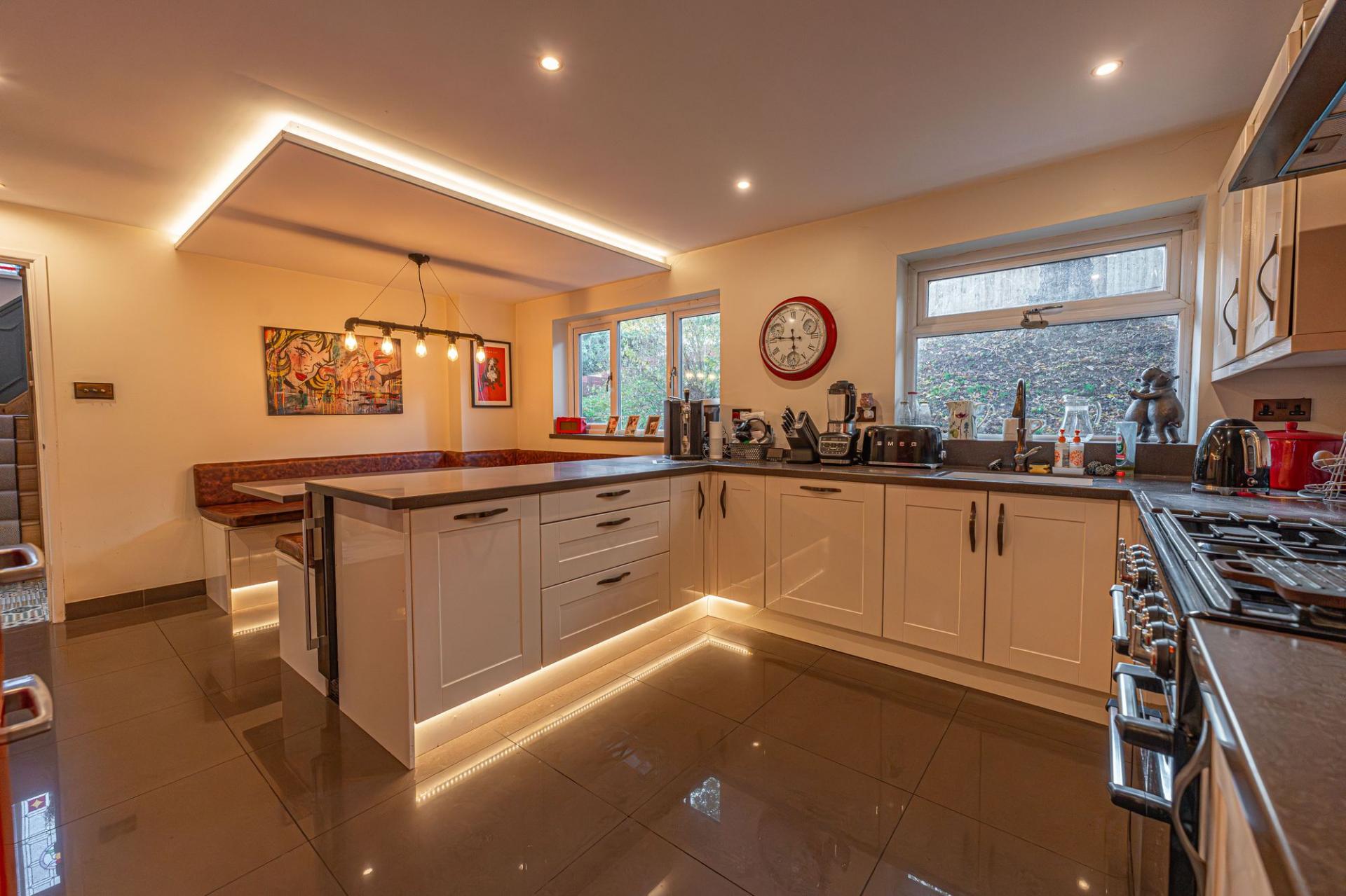 This impressive home is presented to an outstanding quality throughout, and is defined by an array of premium finishes and features, and an incredible degree of living space. Upon entry to the property we are led through the welcoming entry foyer, into the expansive living room to the rear of the house, which is flooded by natural light, and an abundance of space for lounging, dining and entertaining guests. Another great dining space can be found with a fitted booth in the kitchen, which offers a stylish, practical design, with several integrated appliances and numerous storage fixtures. The kitchen is further reinforced by a helpful utility room, while from the hallway we can find understairs storage, and a helpful W.C with an airing cupboard.