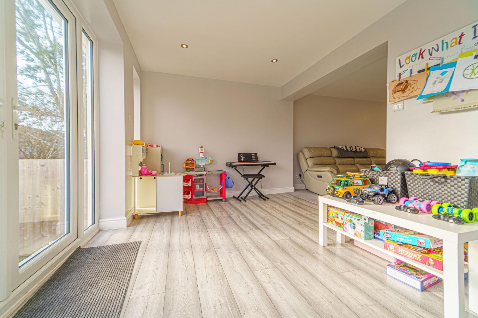 Having been newly redecorated throughout and presented to a beautiful standard, we enter this stunning family home to the front, where we are welcomed through the entry hall and into the spacious living room. This incredible reception room is sized to allow for various furniture layouts, and also features an open plan design to connect to the marvellous family room at the rear of the house, which is flooded by natural light through multiple windows including doorways to the garden, creating a bright and airy feel that is perfect for an extension of the living room, a children’s playroom or for alternative dining area. The main dining area can be found with plenty of space neighbouring the fantastic kitchen, which has plenty of storage options throughout and various integrated appliances. Also on the ground floor is a utility room with added storage and acts as a dedicated space for laundry, as well as featuring a W.C.