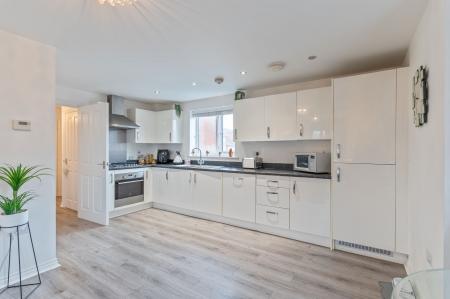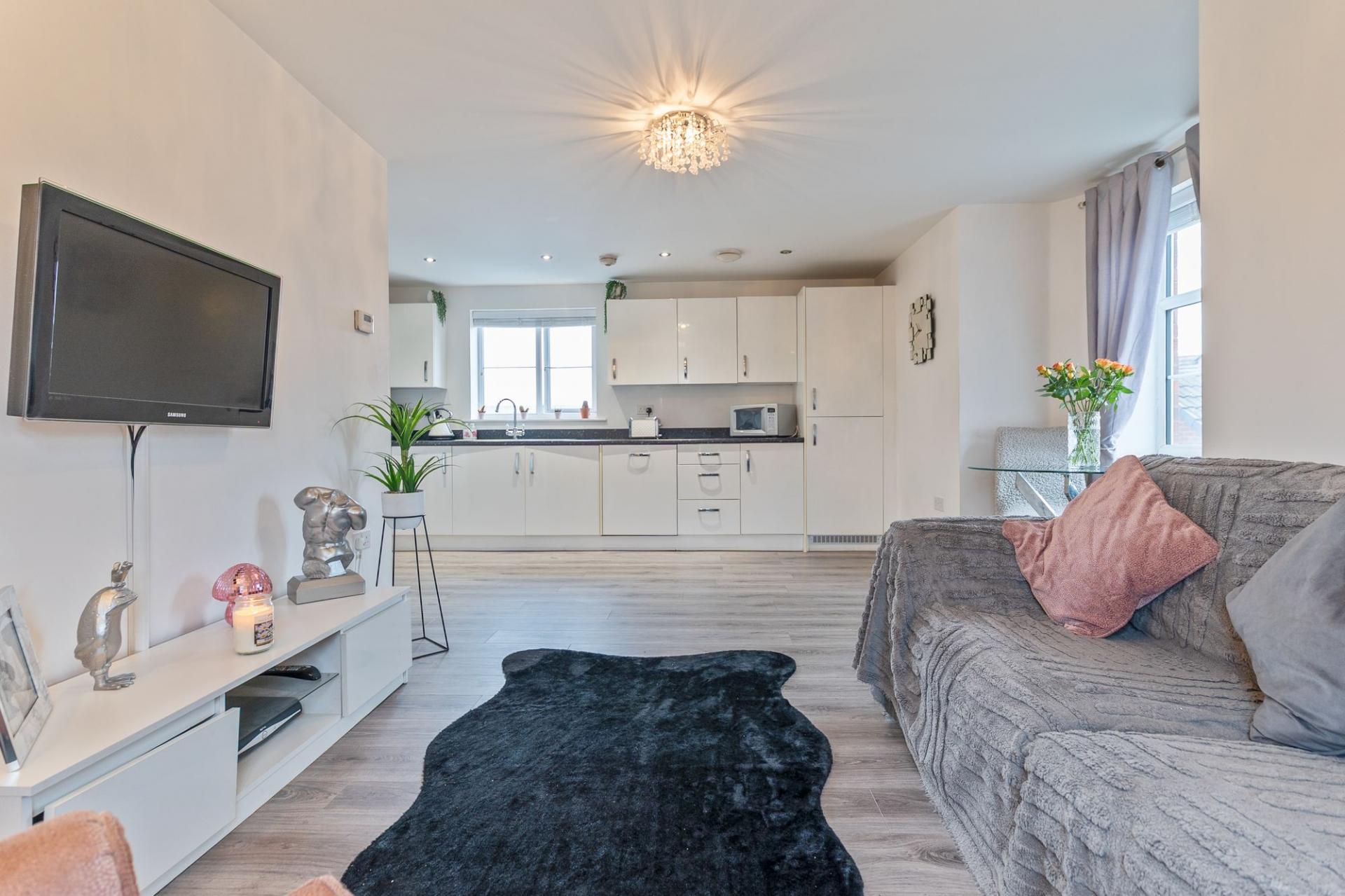 The apartment is accessed via a communal entrance with stairs leading to the first floor, where the accommodation is arranged. Inside, the property features a bright and spacious open-plan living area, incorporating a large fitted kitchen with ample unit and worktop space. This versatile area provides plenty of room for a range of seating and dining arrangements, creating an ideal setting for modern living and entertaining.